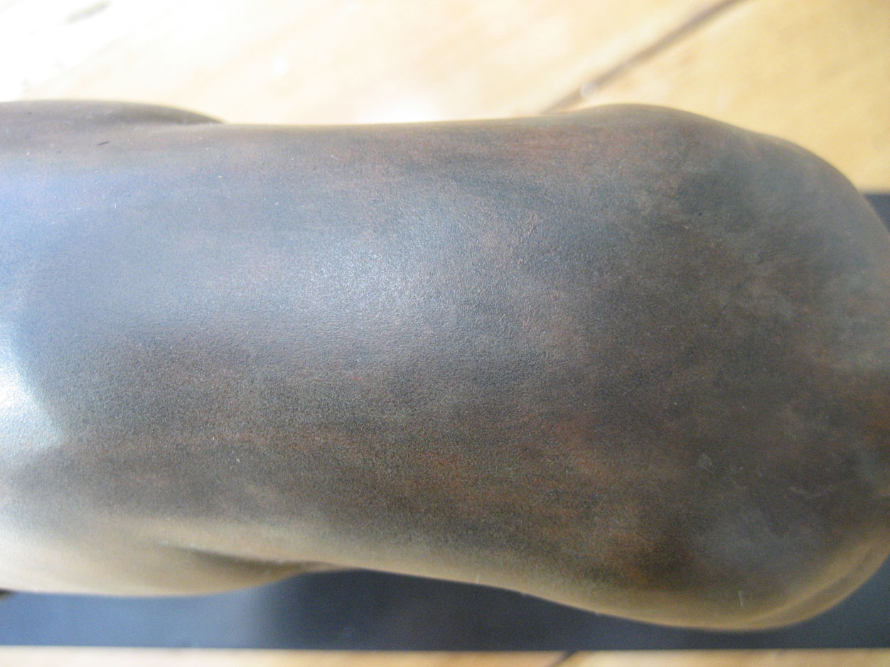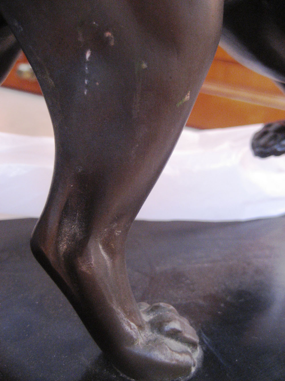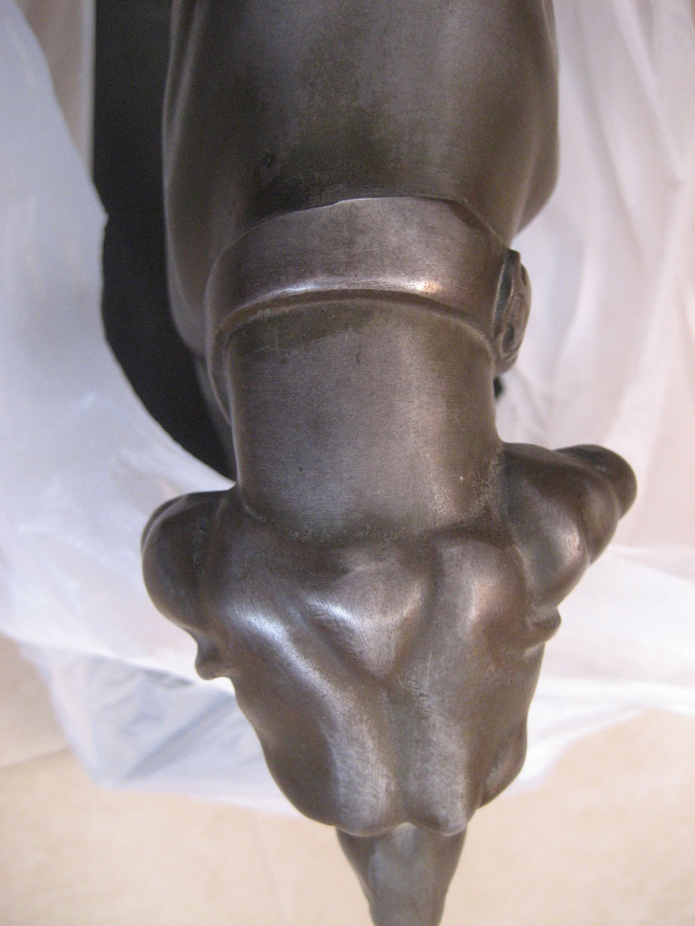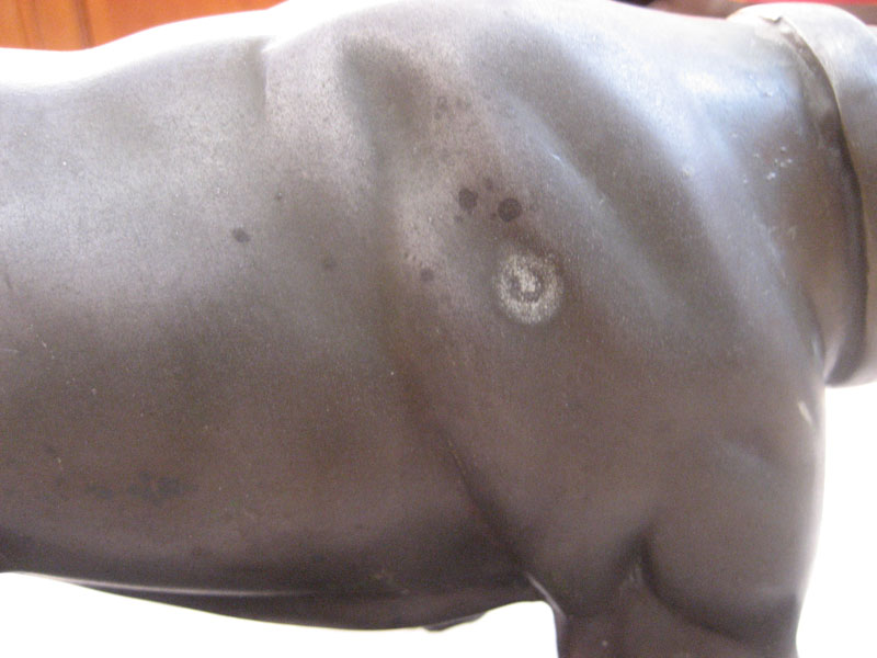 Sur la tête et la queue, c'est comme s'il y avait plusieurs "couches" de métal. En fait, j'ai retiré la patine en ponçant, comme sur le corps, mais à ces endroits il est apparu comme de petites taches grises, et en continuant à poncer les "taches" s'élargissent et j'arrive au "même métal" que le corps du chien.