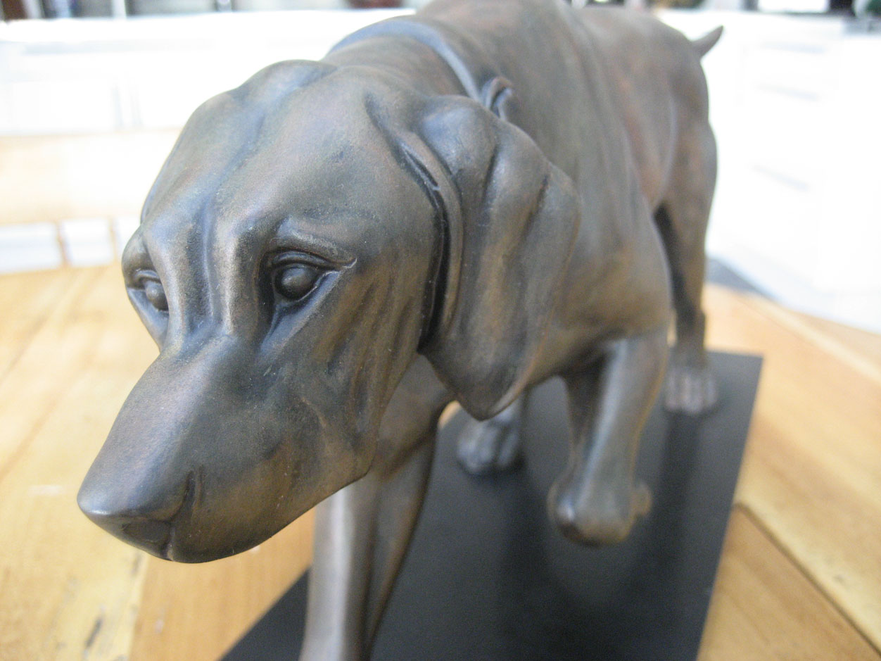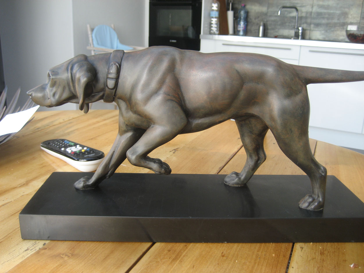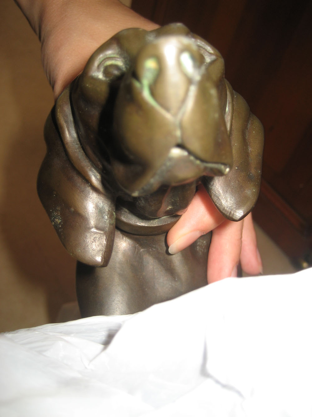 Sur la tête et la queue, c'est comme s'il y avait plusieurs "couches" de métal. En fait, j'ai retiré la patine en ponçant, comme sur le corps, mais à ces endroits il est apparu comme de petites taches grises, et en continuant à poncer les "taches" s'élargissent et j'arrive au "même métal" que le corps du chien.