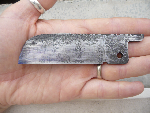 J'ai réalisé pendant les vacances des lames de différentes manières : forgée (le fixe et l'ulu), par enlèvement de matière (le pied de mouton). J'espère avoir fait les bonnes normalisations, le bon recuit, la bonne trempe. J'ai essayé la trempe sélective. Au chalumeau mélange de gaz avec prédominance propane. Bon. La lime glisse, normalement ça va.