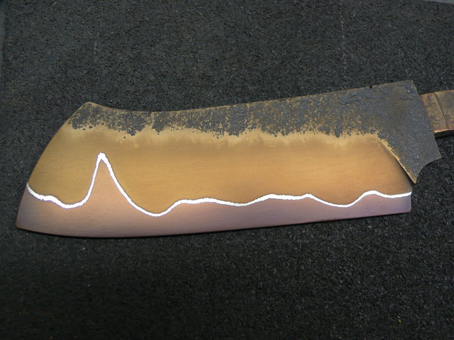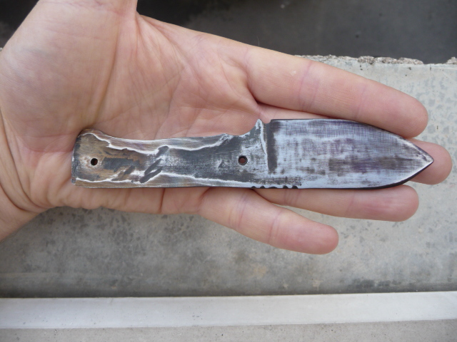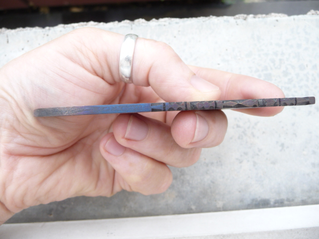 Mon problème, c'est le revenu. Je le fais au four de cuisine. Cette fois-ci, sur les trois lames, j'ai eu des couleurs de revenu très rapidement au bleu sombre (d'habitude, je les mets une heure à 220°, c'est bon), et une sorte d'arc en ciel sur plusieurs strates : plein de couleur à droite du bleu au dos par exemple, sur le flan plein de couleur à droite du bronze, et sur le tranchant ça va du bleu sombre à la pointe au bronze en passant par le violet... Je n'y comprend plus rien. Les lames précédentes, revenues au four, donnaient des couleurs par strates, sans mélanges, une heure à 220°.