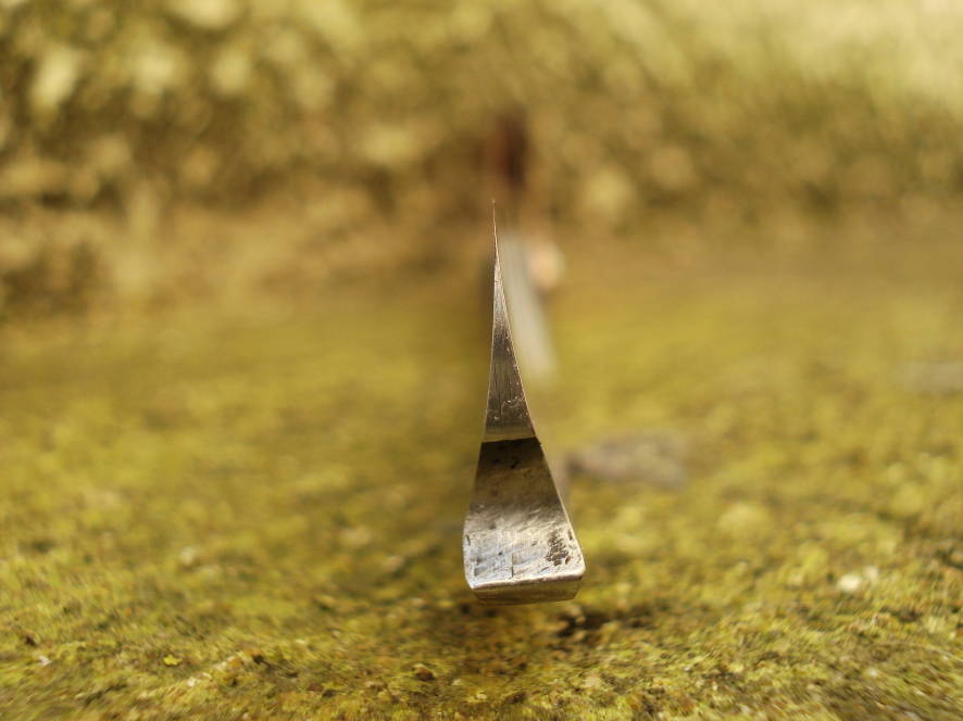Pour l'affutage, l'émouture est réalisée à 0,1mm d'épaisseur (à la bande 500), puis pierre 800, 1000, 3000, 5000, 12000, jean et pâte rouge, cuir et pâte verte, cuir nu.