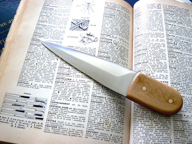 Le coupe-papier est forgé dans un acier carbone (XC80). La finition est poli miroir. Le manche est composé de deux petites plaquettes d'olivier collées et rivetées sur la plate-semelle.