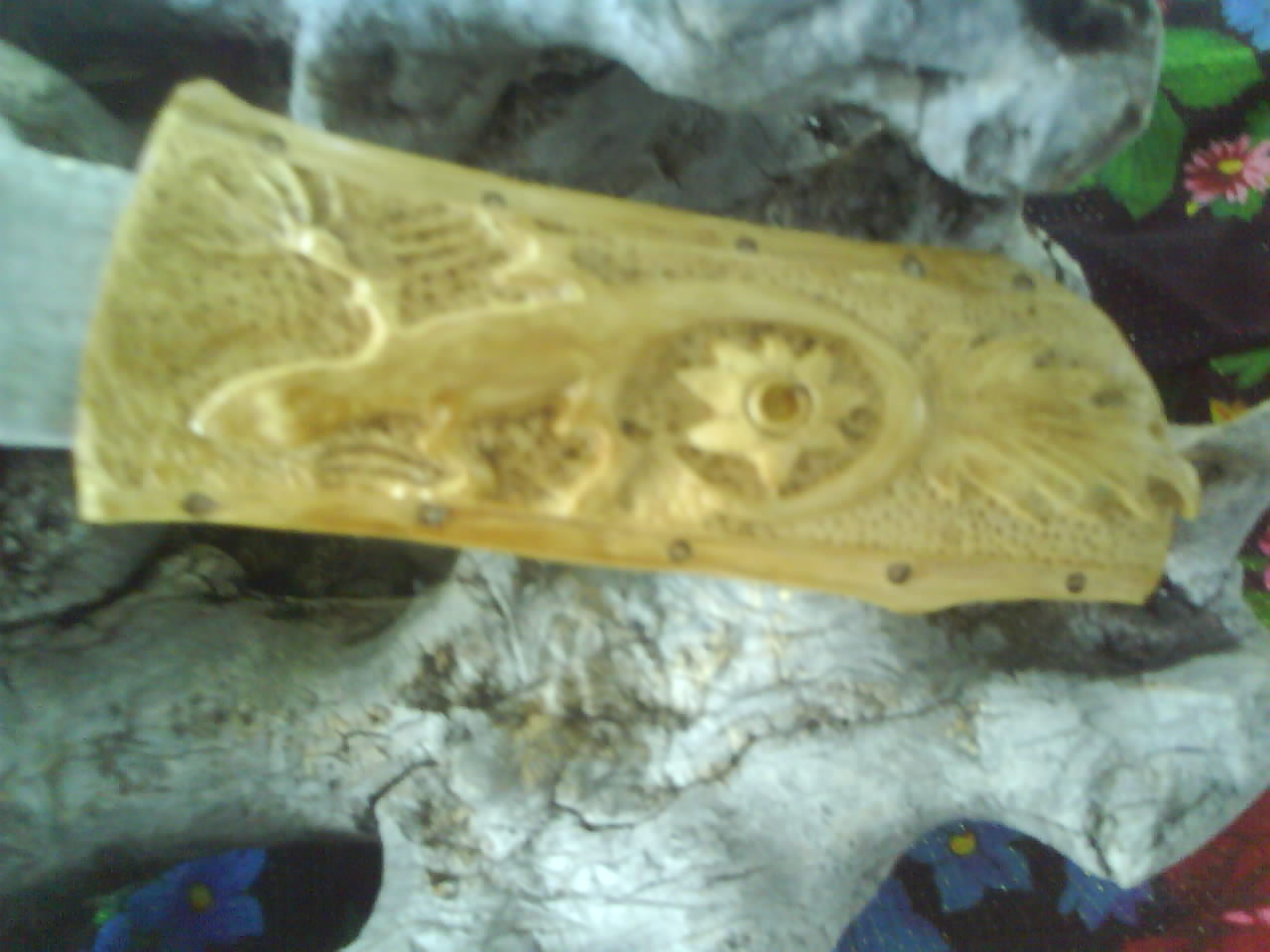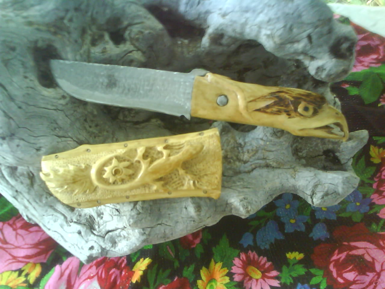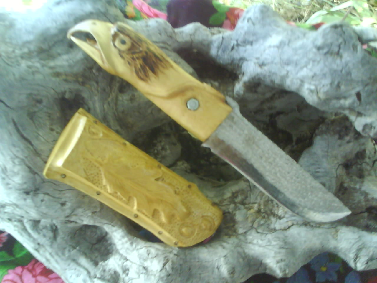 Le manche est en buis sculpté à la mini-perceuse, ainsi que l'étui qui représente un lézard d'un coté et une feuille de chêne de l'autre, colle entre les deux parties et chevilles... minuscules. Je n'avais pas de perceuse à l'époque - cela fait 2ans -, donc j'ai mis mon morceau de branche dans l'étau et à la scie à métaux. Les trempes et revenu ont étés faits au chalumeau.