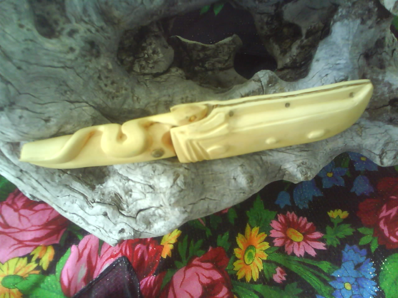 C'est un couteau en acier agricole de longueur approximative 17 centimètres, épaisseur 2,5 centimètres. Ni trempe, ni revenu : c'etait mon premier couteau. Le manche est en buis, collé et chevillé ; la vipère sculptée au cutter et à la dremel.