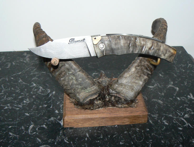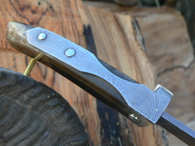 Le manche est en corne de mouflon, la lame et le ressort en damas, la palette du ressort est en ivoire de mammouth.