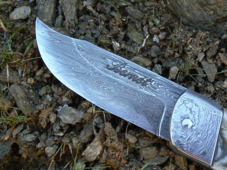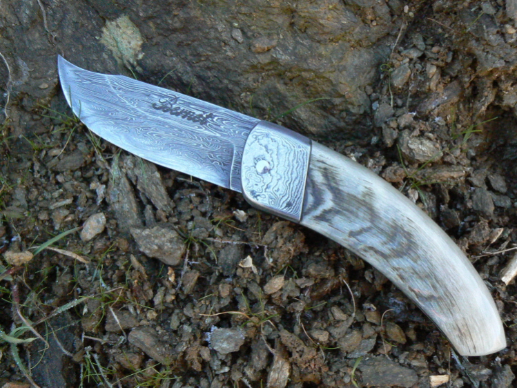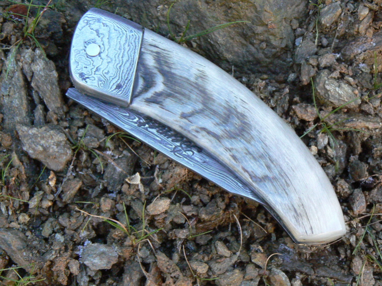 je vous montre ici un couteau corse en bélier, montage plein-manche avec mitres et lame damas.