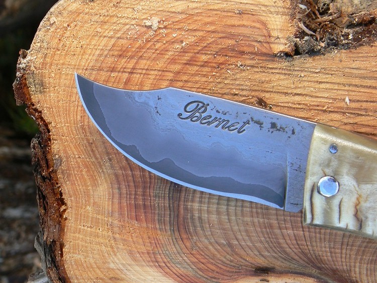 Voici le couteau d'Ascu que je viens de terminer : il est en corne de mouflon, et sa lame est composée d'une couche de 90mcv8, deux couches de 15n20 et deux couches de vieux fer.