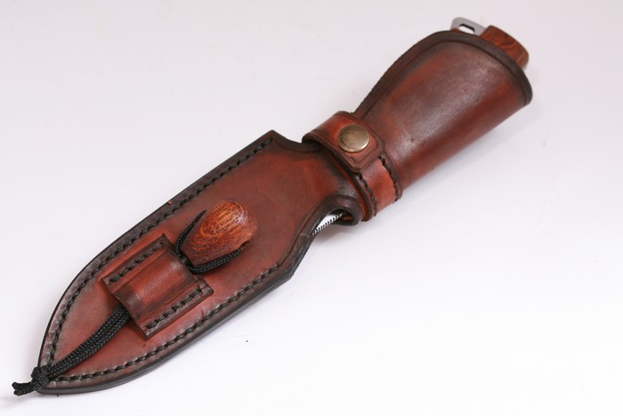 Au passage, bravo pour le travail du cuir, de plus en plus élaboré. Personnellement, j'aime beaucoup le principe de l'étui enveloppant, autour du manche. Les modèles que réalise Maryline Lecourtier pour mes couteaux sont sur le même principe, et ils font l'unanimité parmi les utilisateurs.