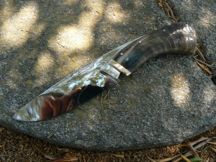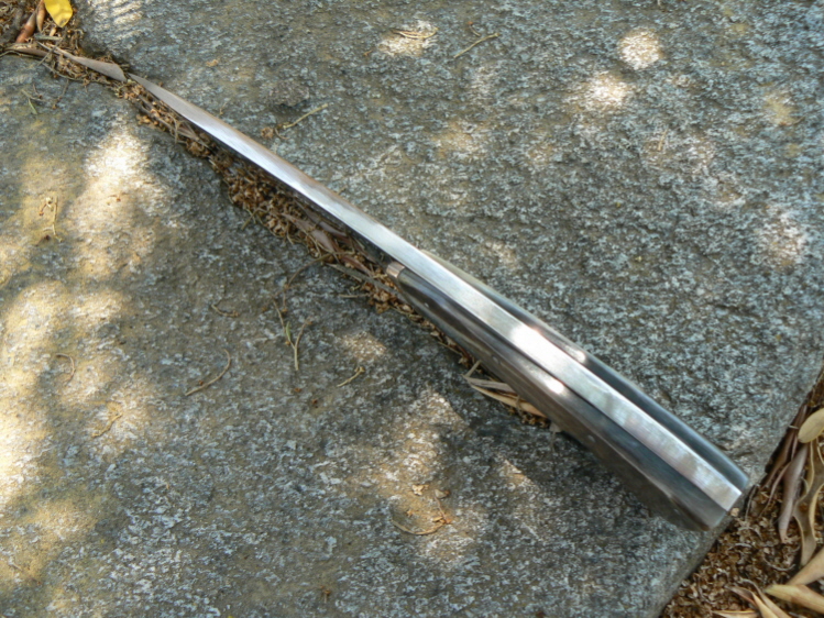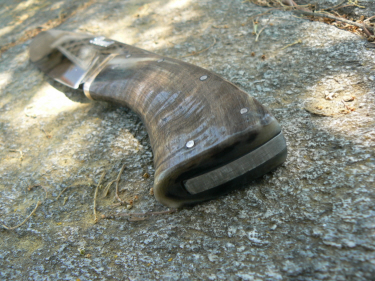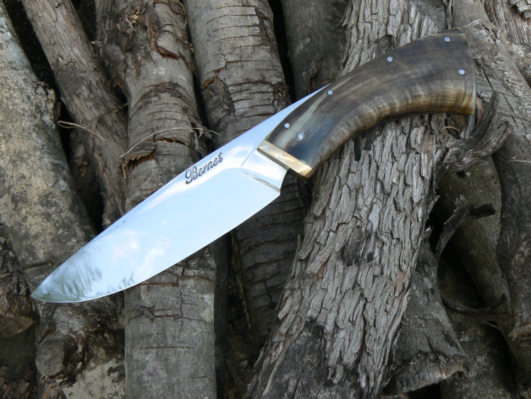 Pour la ligne, je me suis inspiré d'un couteau vu dans un magazine, forgé dans une lame de ressort, garde en bonze rivetée et étamée, plein-manche en bélier sur plate semelle, collé et riveté.