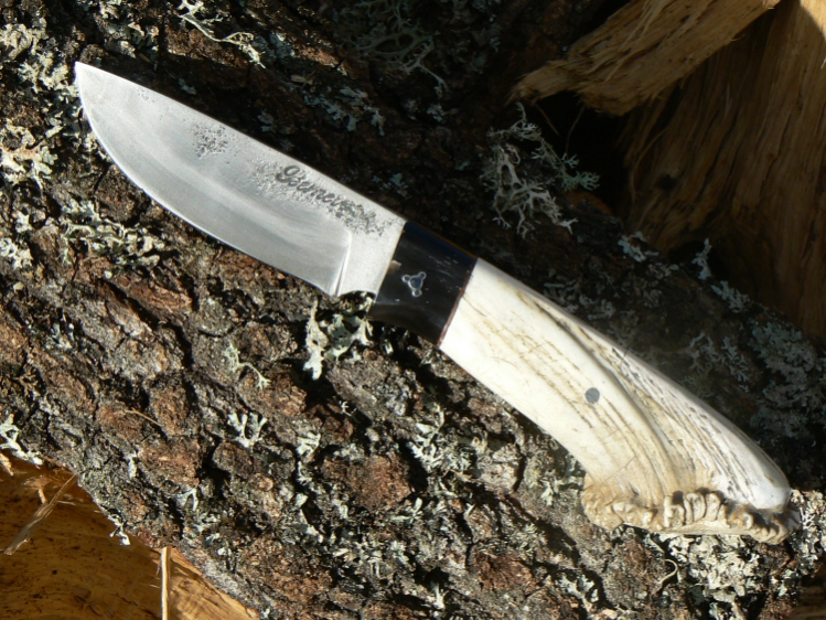 Le manche est en buffle et bois de cerf avec sa couronne, tous deux séparés par une rondelle de cuir.