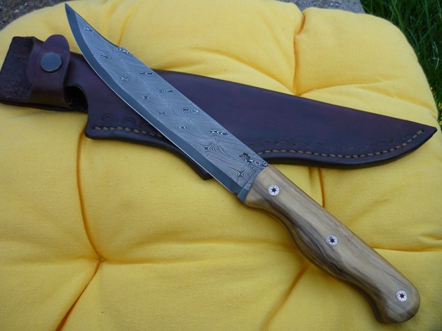 Un couteau droit en damas, 2 torsades + un tranchant rapporté, manche en buis, étui en collet végétal cousu main, le tout fabriqué maison.