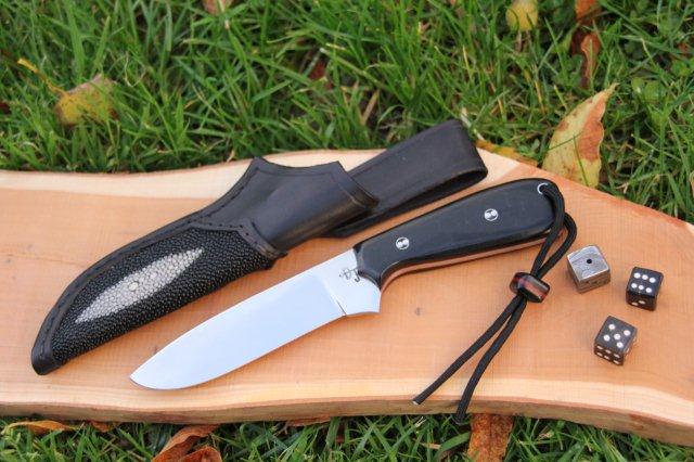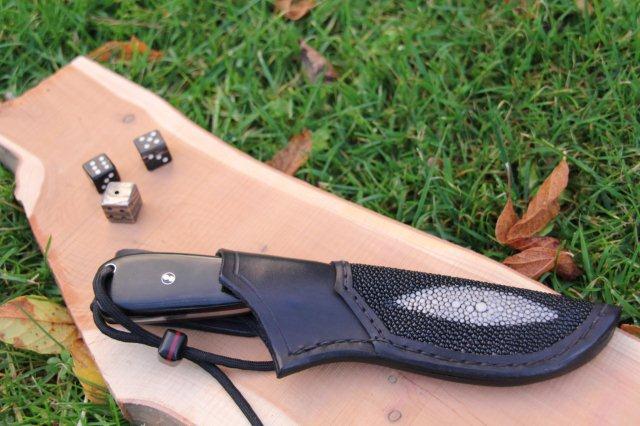Voilà un couteau non forgé car réalisé en RWL34 (acier inoxydable en gros) et avec des plaquettes en micarta noir et intercalaire rouge.