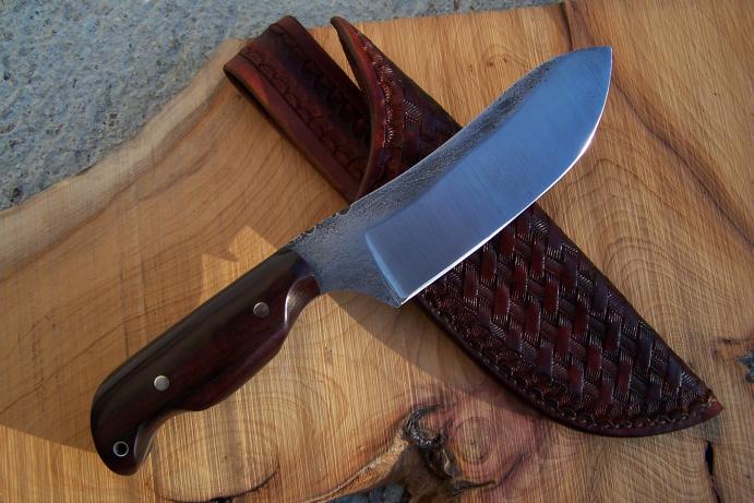 Ce couteau est inspiré de la forme particulière du Nessmuk, forme que j'affectionne. Il est en XC75 avec une trempe à l'huile. Ses plaquettes sont en palissandre rouge et avec un veinage noir (les photos ne rendent pas assez bien la couleur). Il mesure 23 cm pour 12 cm de tranchant.