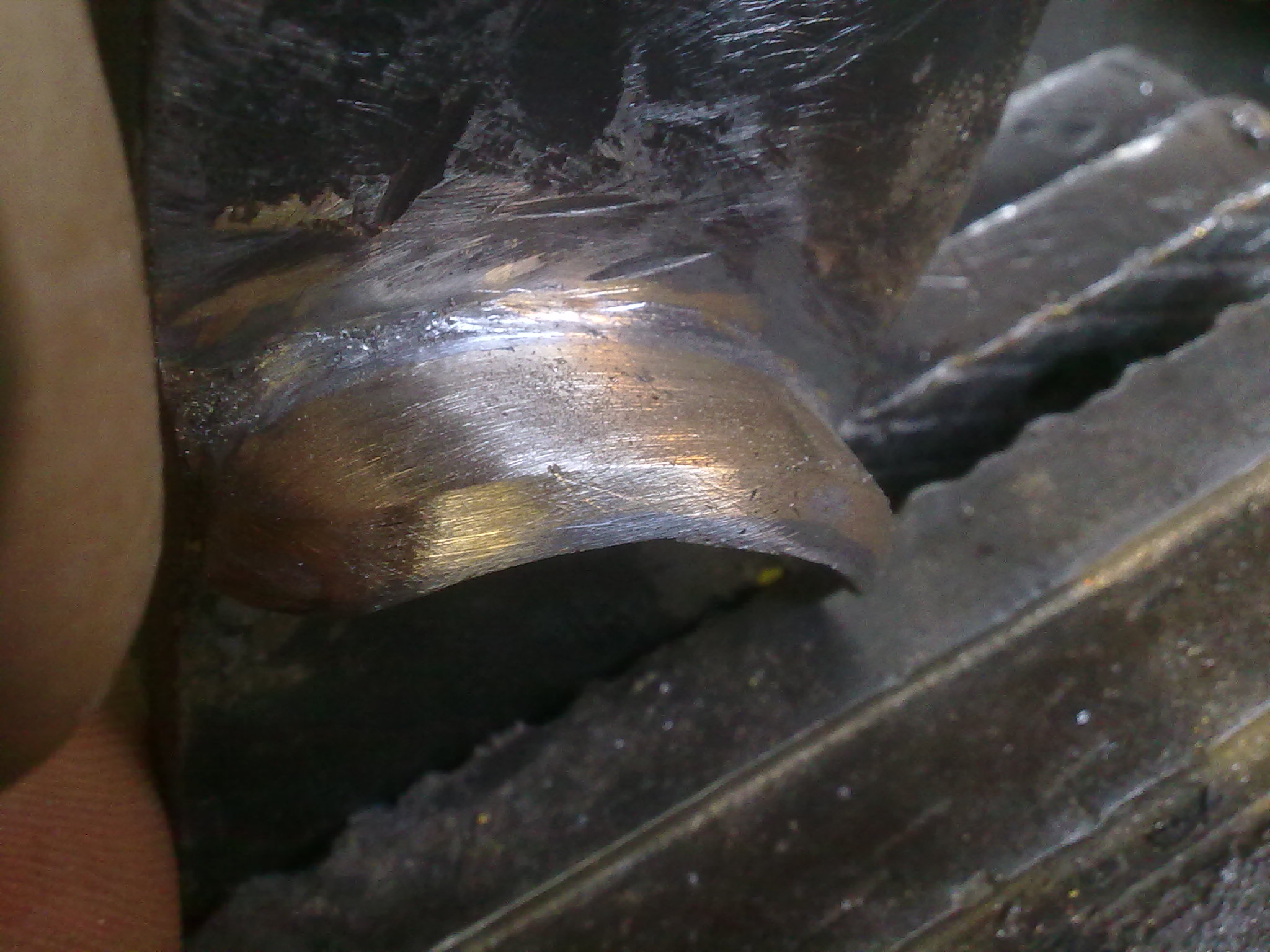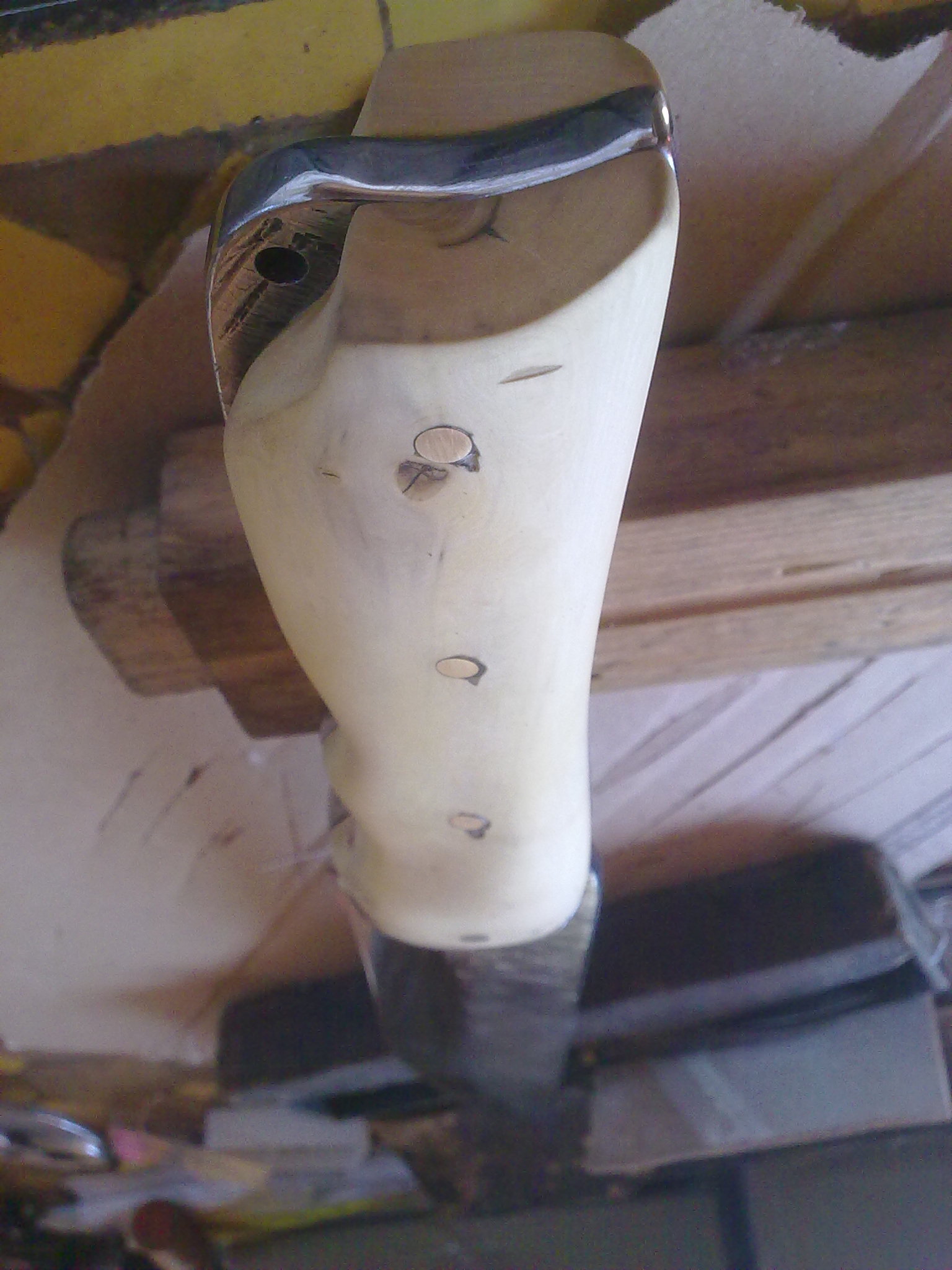 Il est réalisé en acier ressort de récupération. Il est trempé intégralement à l'huile puis revenu une heure à 200°C . Le manche est en buis collé (epoxy) et rivets laiton. La garde est faite d'un morceau de tôle de 2mm soudé à l'arc sur la lame et sur lequel j'ai coulé du laiton pour avoir un jeu de superposition.
