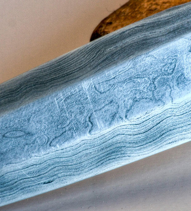 * Lame damassée composée d'acier Nicholson USA (râpe de Maréchalerie en pur acier) et d'un acier plus tendre (râpe suisse). Je ne sais pas si celle-ci est en acier pur, je pencherais pour un coeur en fer. Il s'agit d'une trousse de 5 éléments repliée/soudée 5 fois au marteau ; environ 200 couches donc.