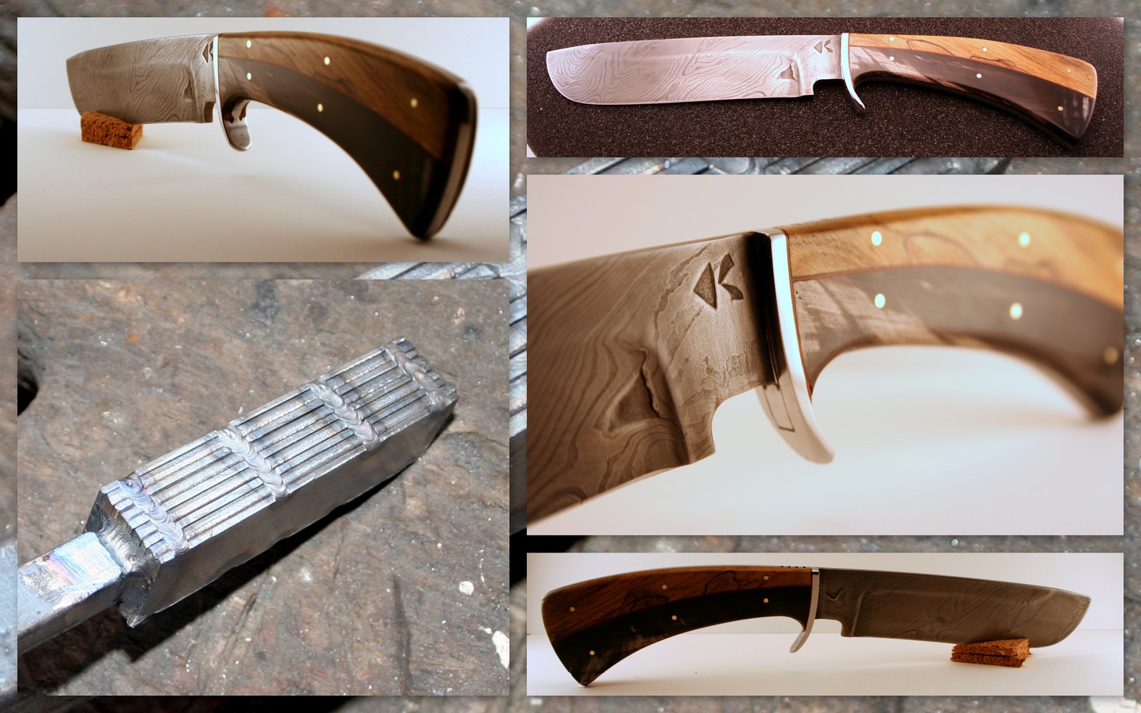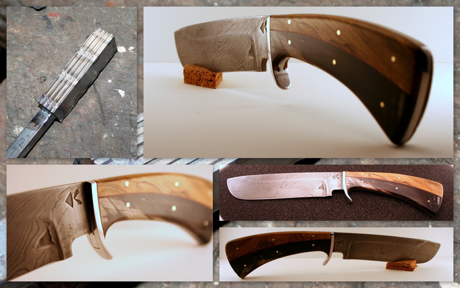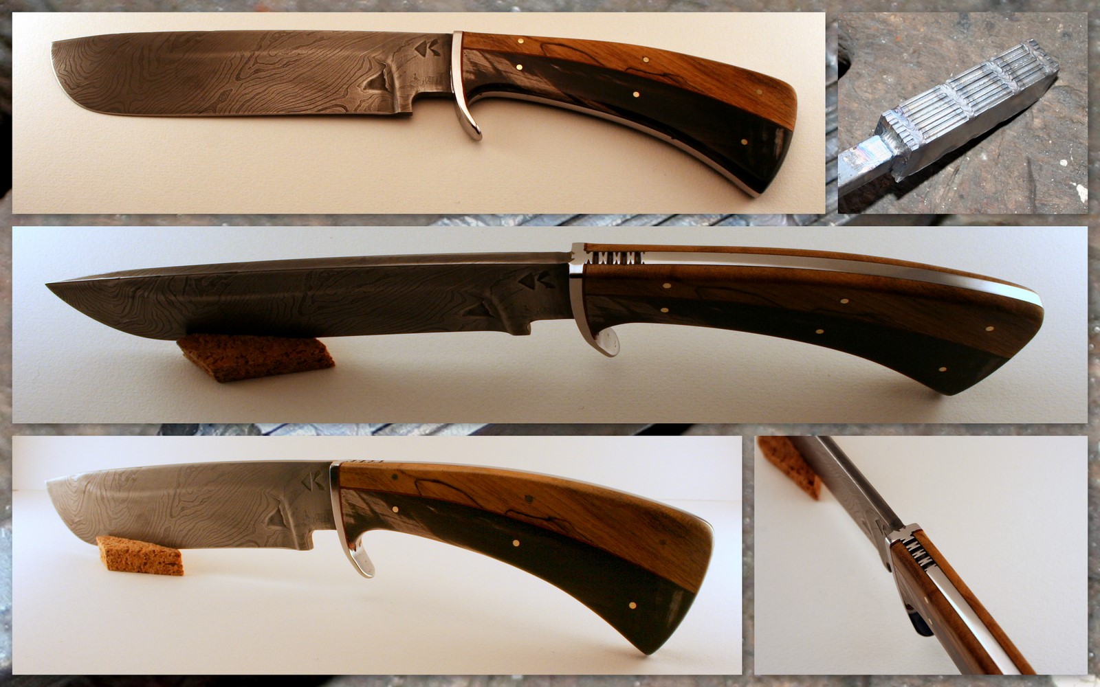 C'est mon premier damas multi-couches : 9 épaisseurs de départ soudées et étirées puis pliées en 3 ; puis étirées de nouveau et pliées en 2. Mise au carré et torsade.