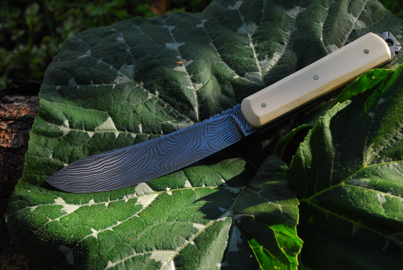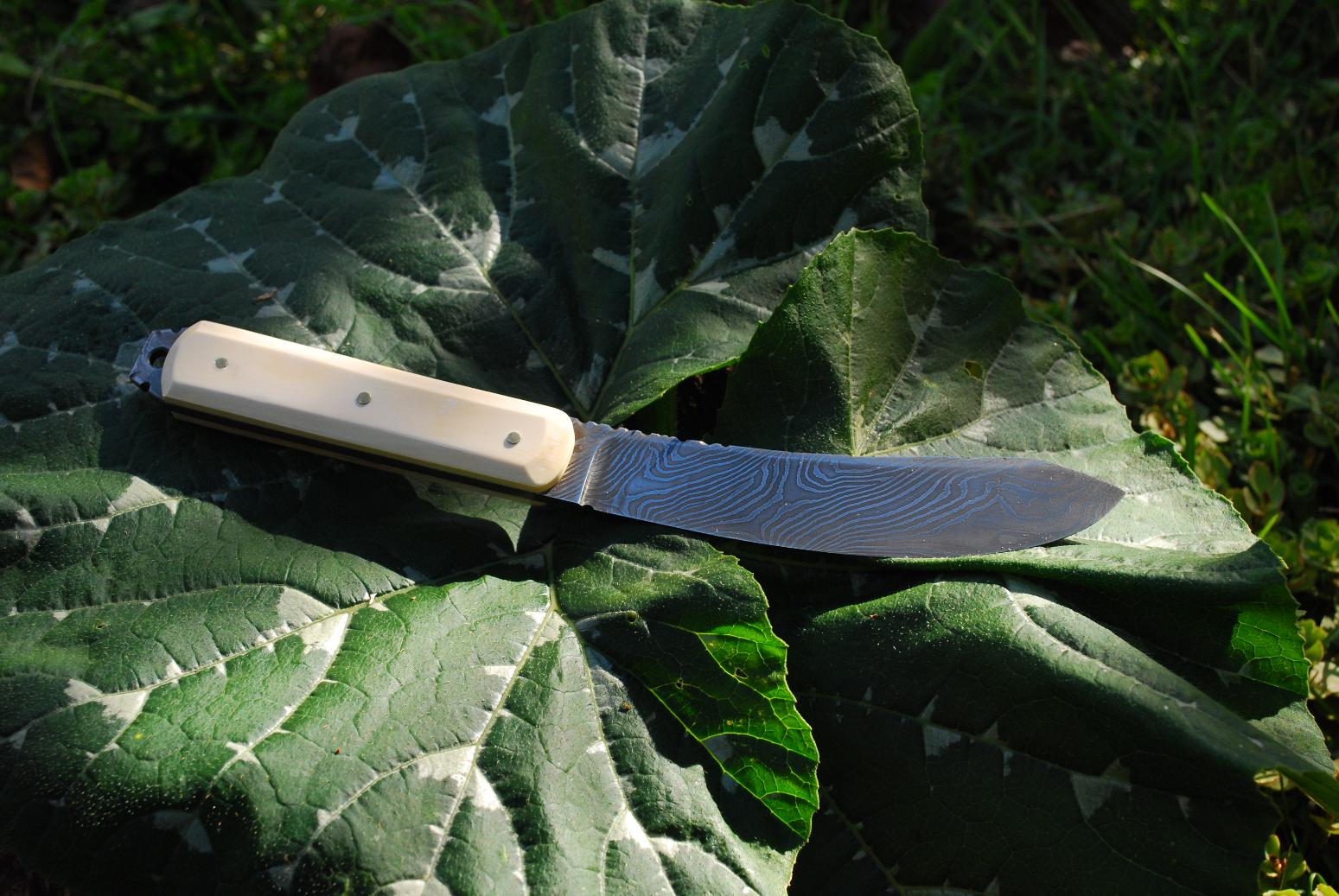 Voici encore un green river. Le couteau mesure 23 cm dont 11,5 de lame en damas 44 couches en XC 75 et 15n20.