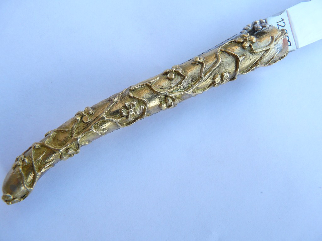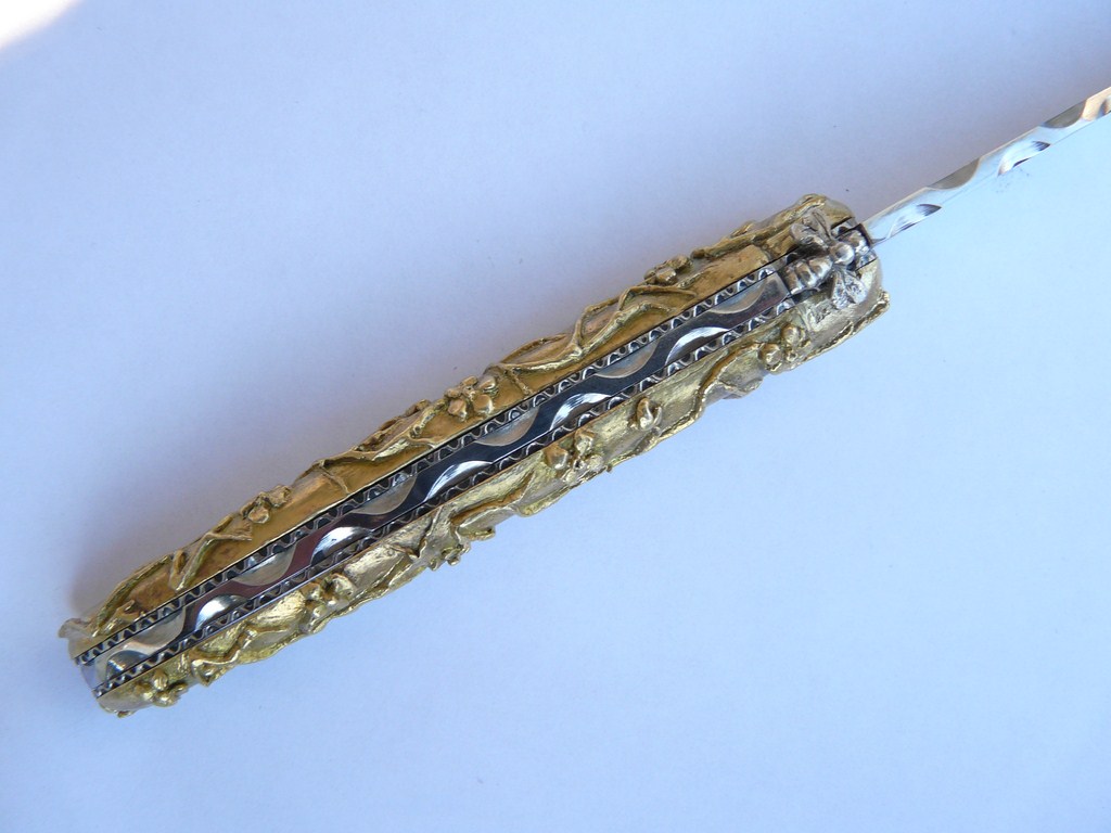 Le couteau pèse 100 gr, je ne le trouve pas très lourd, même pour une femme. Les évider (ou les coquer) ne me ferait pas gagner grand chose, si ce n'est sur le prix de la matière : ok, ce n'est pas de l'argent mais le laiton a lui aussi beaucoup augmenté. De plus, le problème est au montage : le Laguiole a un 3ème axe fixé à l'intérieur et que l'on ne voit pas, le couteau terminé ; en coquant le manche, l'axe risque de "flotter". J'avais pensé remettre de la résine, mais bon... ça fait une manipulation en plus pour pas grand chose !
