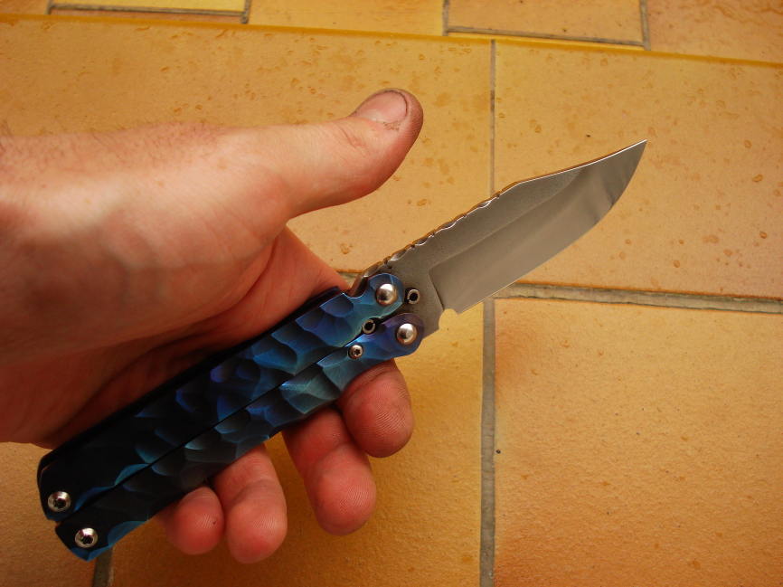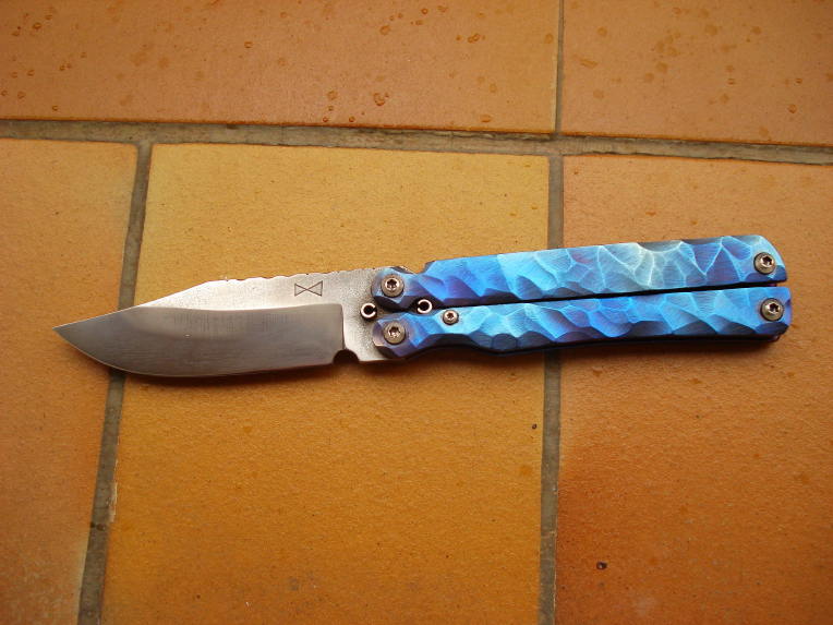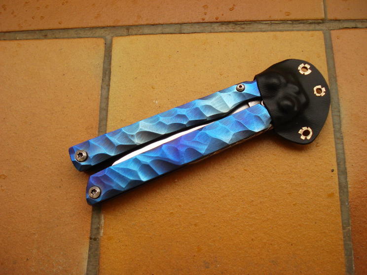 Voici un couteau papillon en Ta6V4 et 100MnCrW4, toxifié et anodisé à chaud.