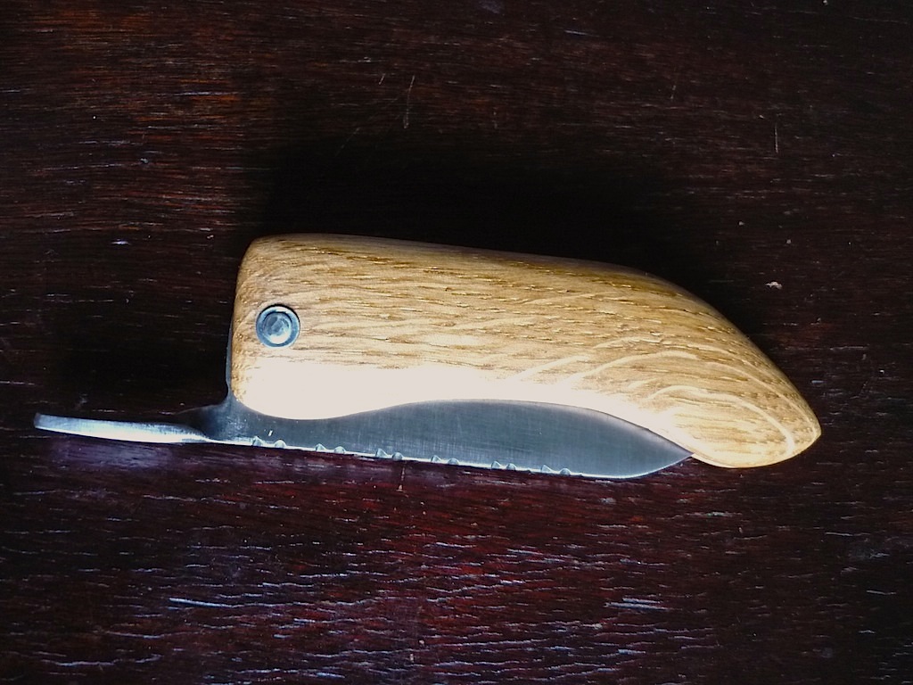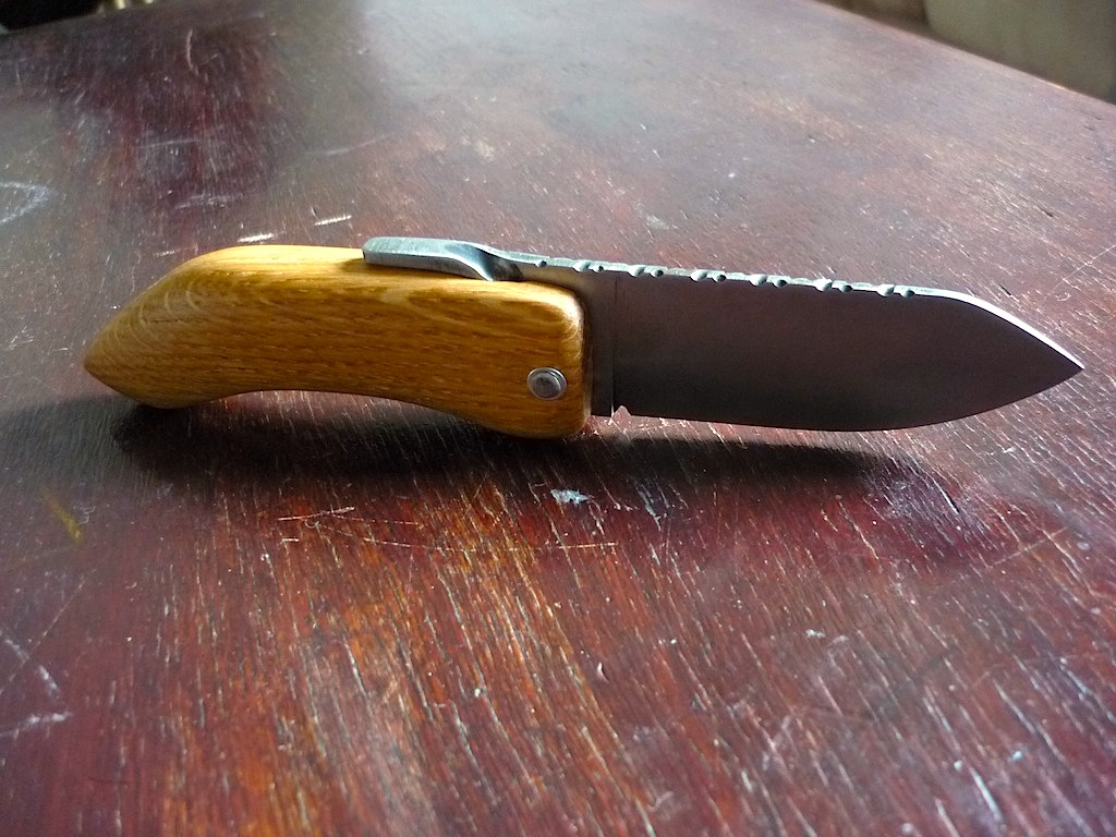 C'est la première lame de ce type que je réalise ; le manche en plein bois est aussi une première (j'avais déjà fait des manches avec un intercalaire et plaquettes collés).