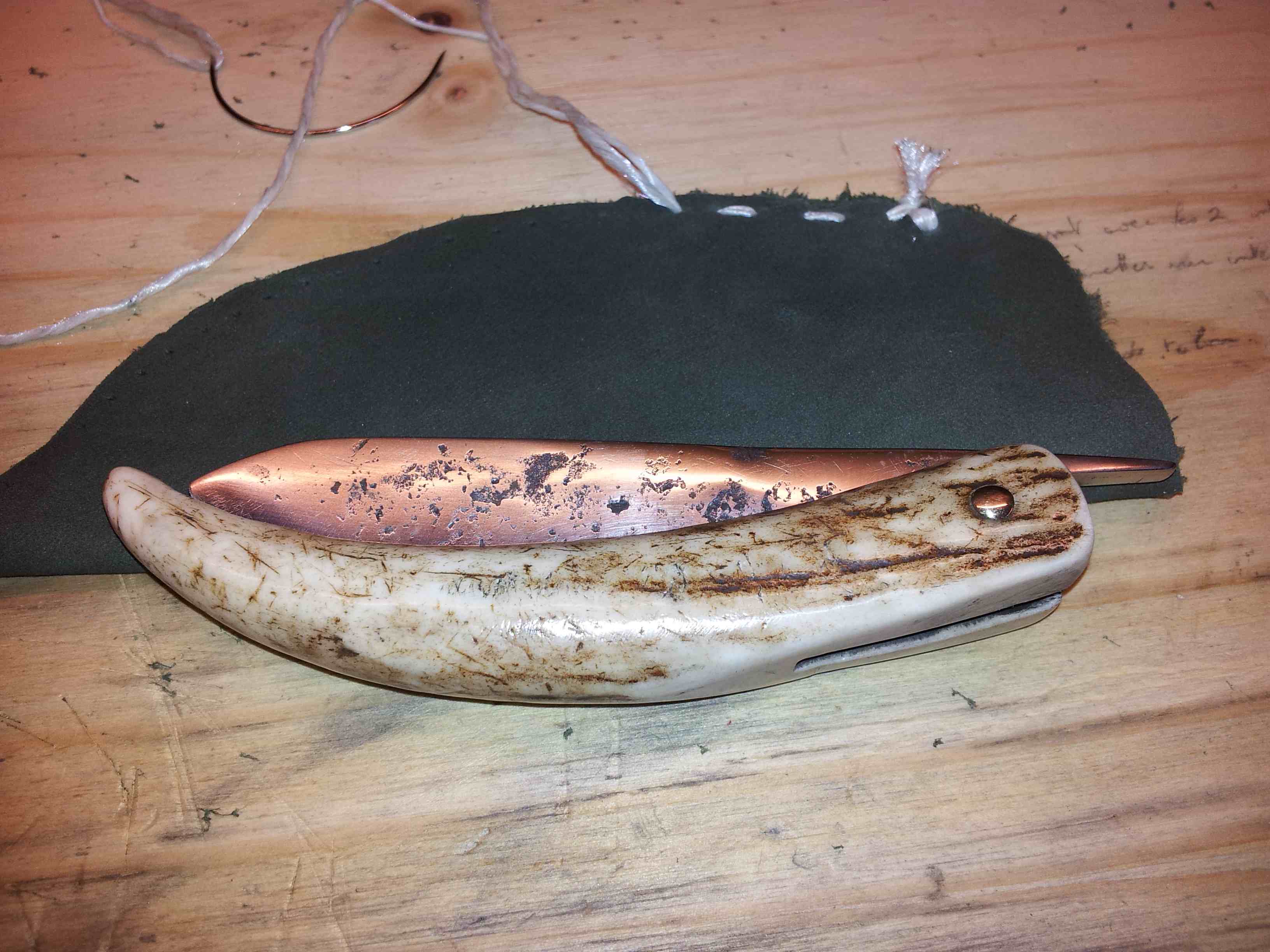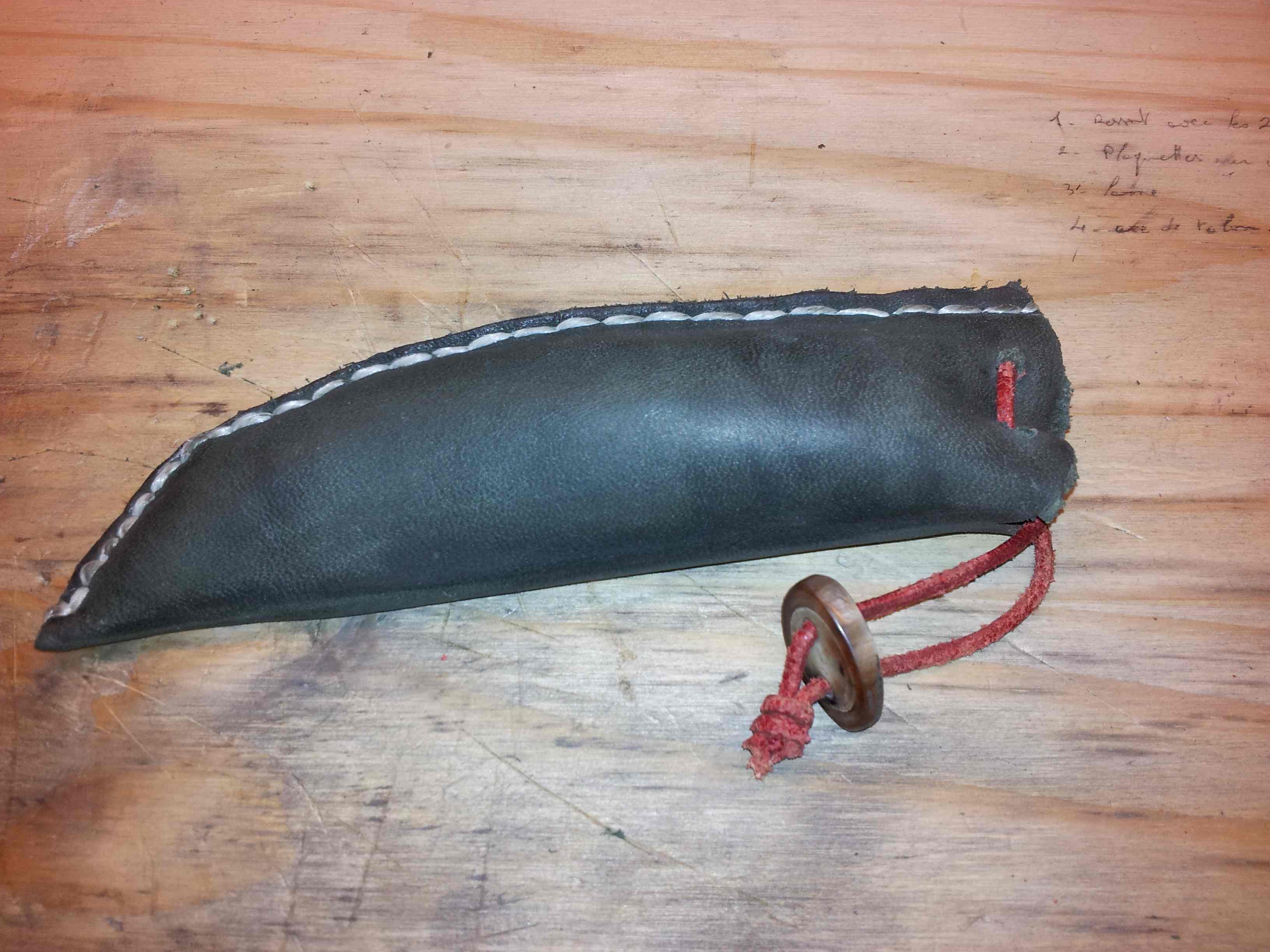 L'étui est ma première réalisation. Il est en peau de mouton avec une couture fait main. L'anneau de blocage est en corne de vache.