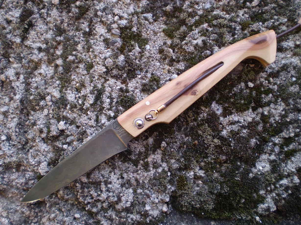 Pour la fiche technique : plein manche en cade, rondelles extérieures, axe et clavette en acier, lacet cuir, rondelles de friction en téflon, perle du lacet en cade, lame en acier damassé maison 144 couches (60Ni20, 110WCrV5 et 90MnCrV8), trempe au goop après 5 normalisations forcées.