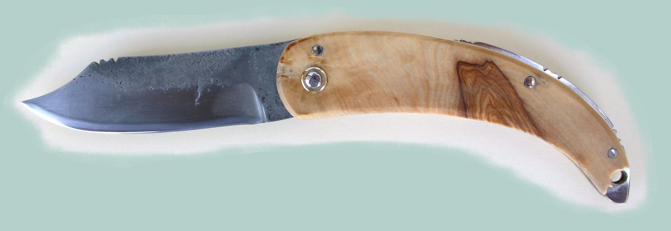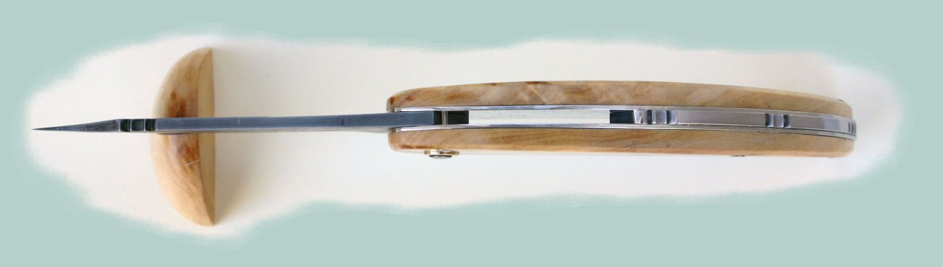 Le manche est en bois d'olivier de Corse, il est plus court que les platines et se termine par une forme en rappel du guillochage de la lame et laisse apparaître un trou dans les platines pour passer un lien.