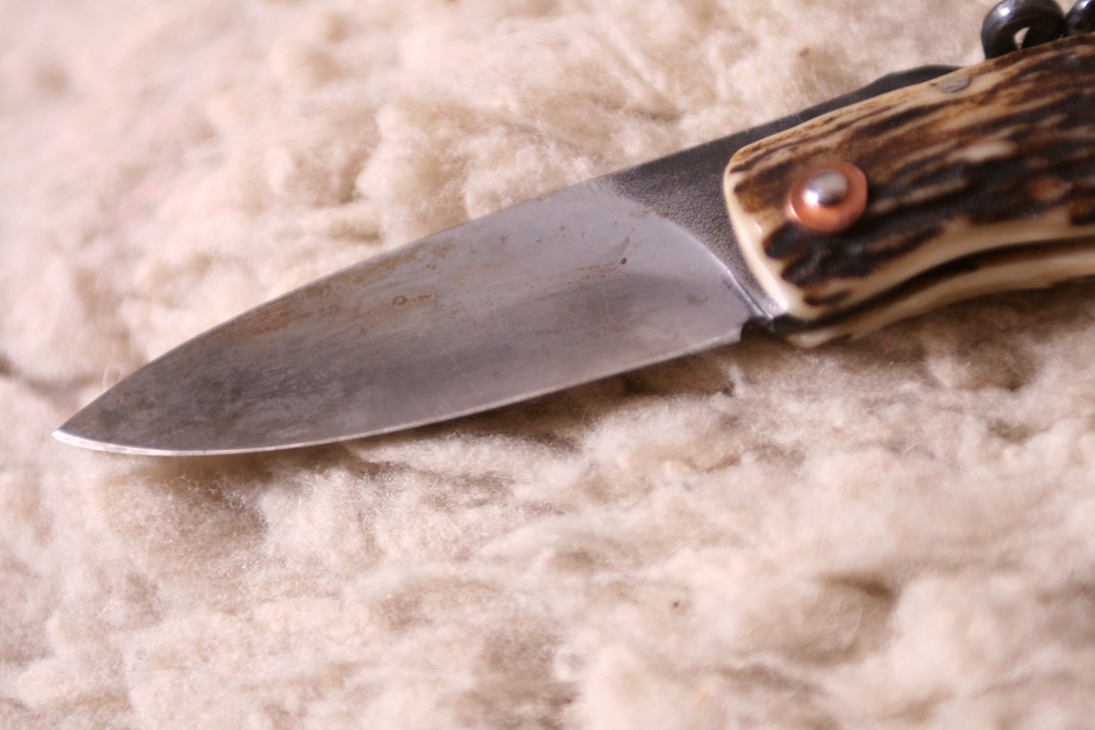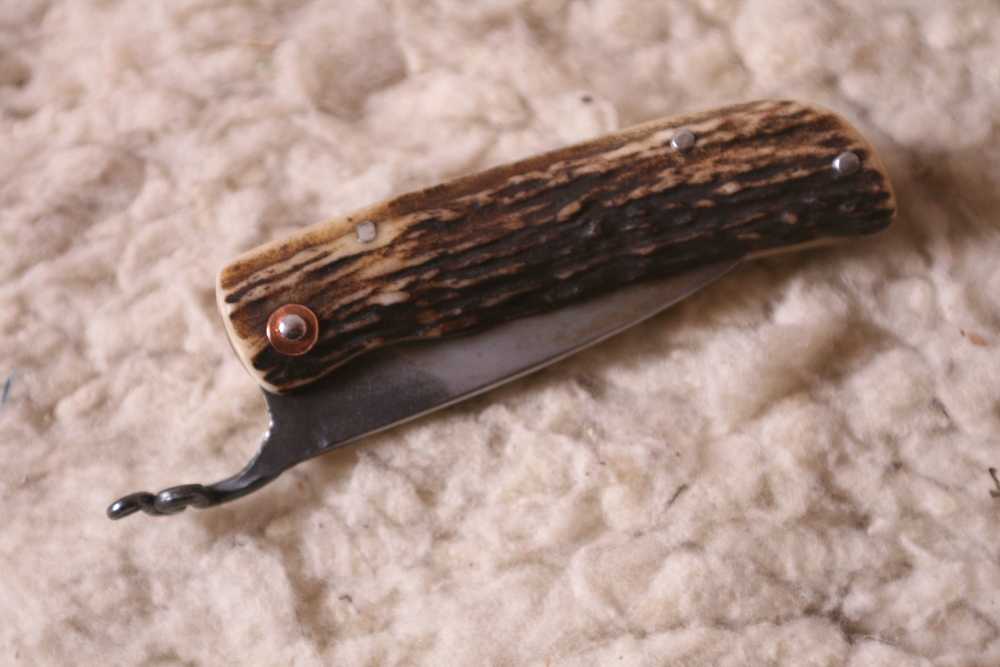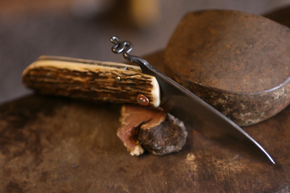 La lame a été faite en stock removal avec intercalaire en XC75 et a subi des normalisations puis une trempe sélective et un revenu "sauvage". La lime ne mord pas et après affutage, le tranchant est très satisfaisant et tient bien dans le temps.