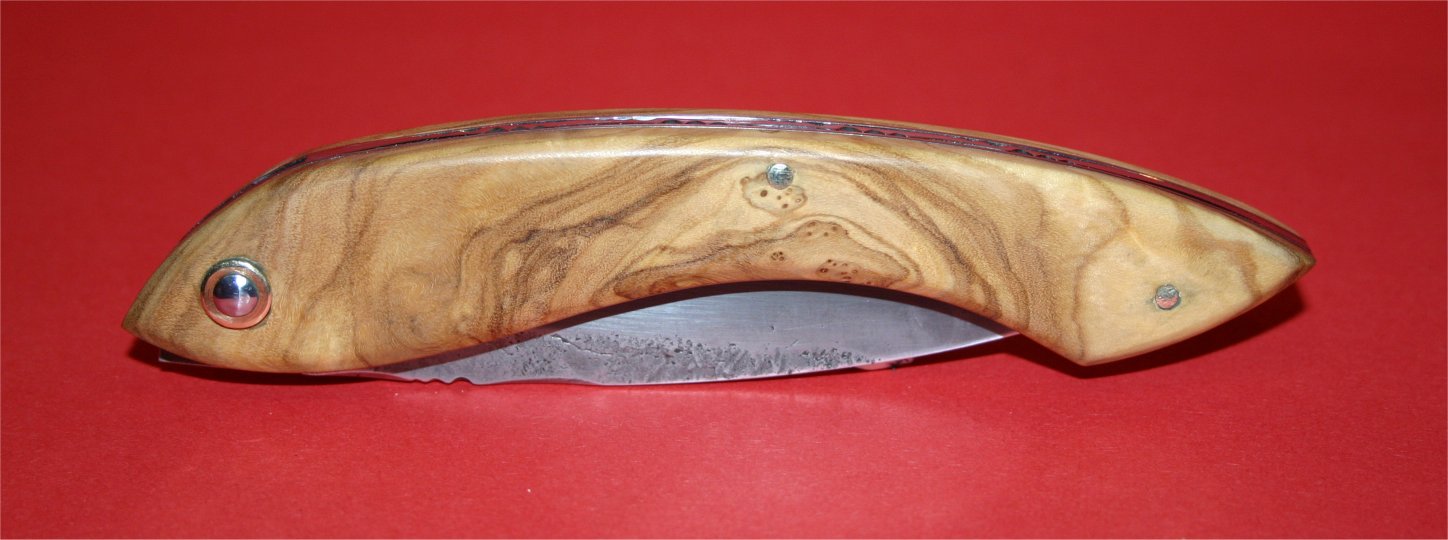 La lame forgée en XC75, trempe à l'huile avec une finition par un traitement au perchlorure de fer et patinage à la main à la laine d'acier.