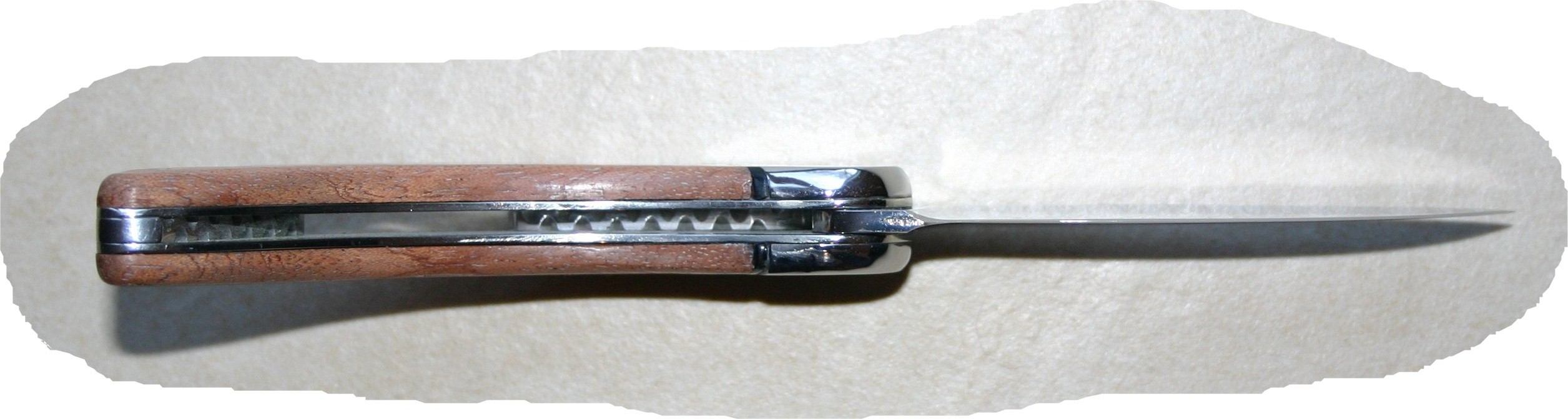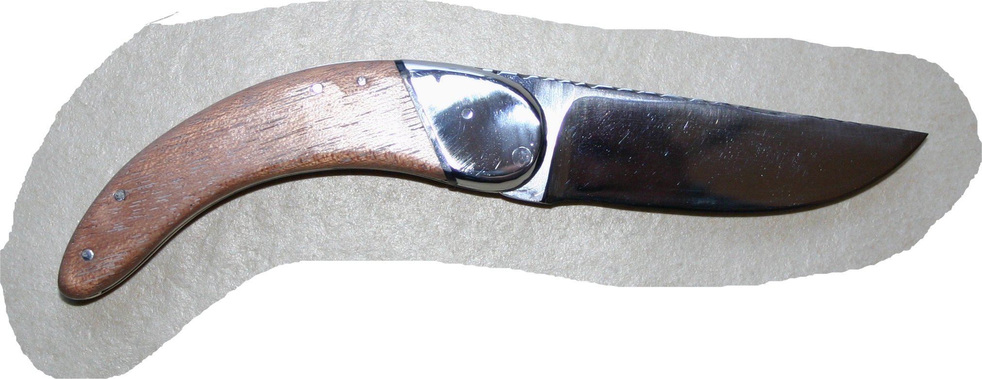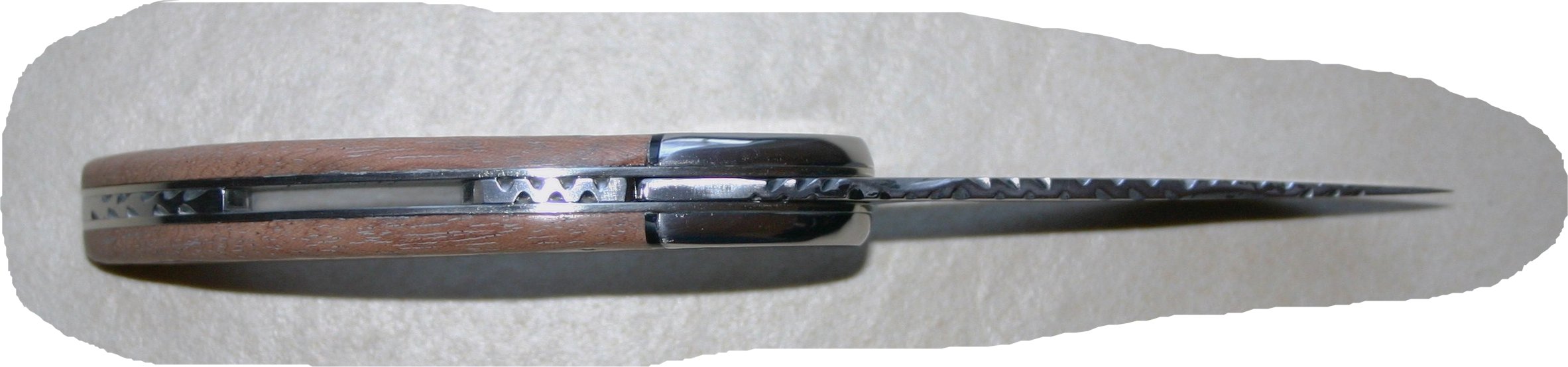 Sur celui ci la lame en XC75 n'est pas forgée. Je me suis essayé pour la première fois à faire un couteau avec une mitre... pas fastoche ! Et un petit intercalaire en plus entre le bois du manche et la mitre.