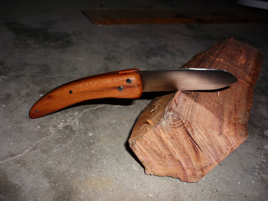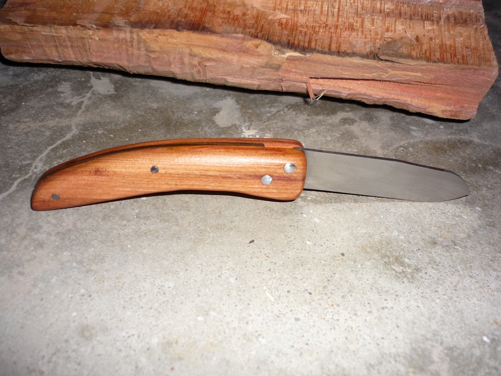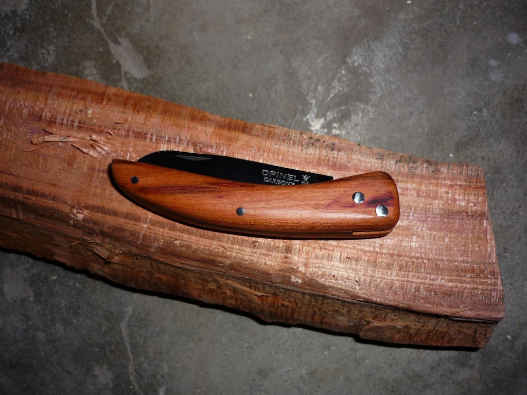 L'inconvénient de l'Opinel, c'est que l'axe est assez en arrière, ce qui donne un ratio manche/lame peu harmonieux à mon goût ; raison de plus pour je me mette à faire les lames aussi.