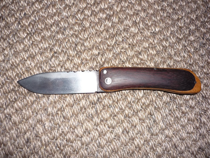 après quelques essais de montage de lames (Opinel entre autres), je me suis attelé à la fabrication d'une lame. Elle est faite à partir d'une lime, détrempée, l'émouture est faite à la lime.