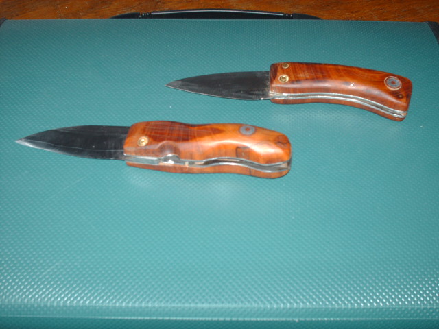 Celui du haut est un système à 2 clous, manche en prunus, rosace déco réalisée avec du tuyau de cuivre, des baguettes aluminium et du synthofer comme fixateur. La lame est réalisée dans un guide de chaine de tronçonneuse.