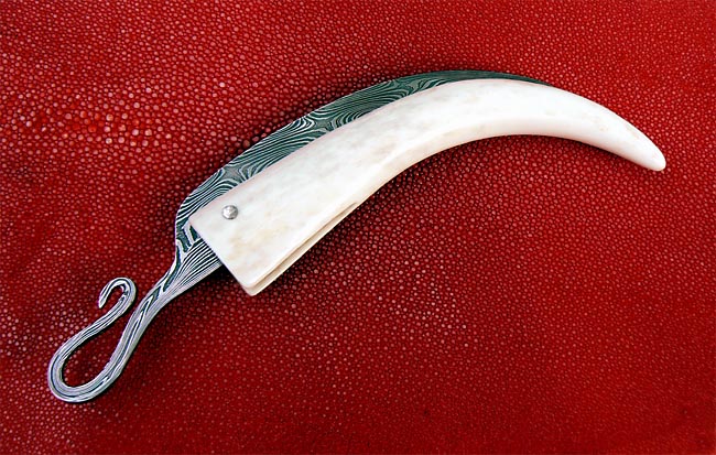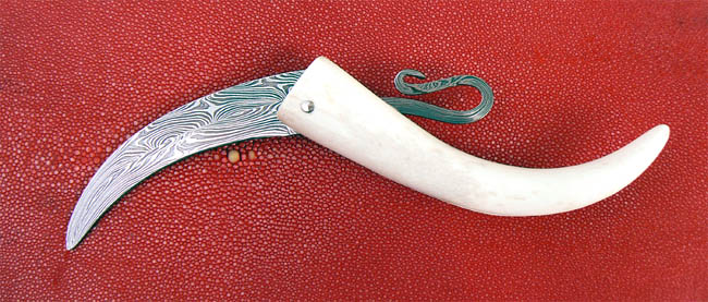 - sa lame courbe épouse la courbure du manche, généralement en corne ou en métal. Elle vient s'insérer dans la courbure extérieure du manche, ce qui fait qu'elle s'ouvre en quelque sorte "à l'envers" par rapport à nos habitudes occidentales;