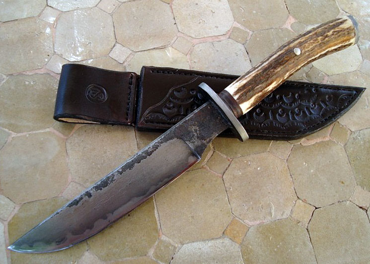 La lame en acier sandwich vieux fer/C130 a subi une trempe sélective au goop, un triple revenu, et un montage sur soie sur un bois de cerf. Le pommeau et la garde sont en vieux fer forgé.