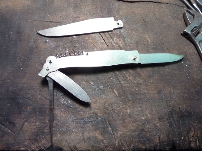 Après avoir fait des recherches sur le net, et mise à part Robert Beillonnet qui en a fait un avec quatre pièces : deux lames, un poinçon et un tire bouchon, il semblerait que rares sont les couteliers à avoir réalisé ça.