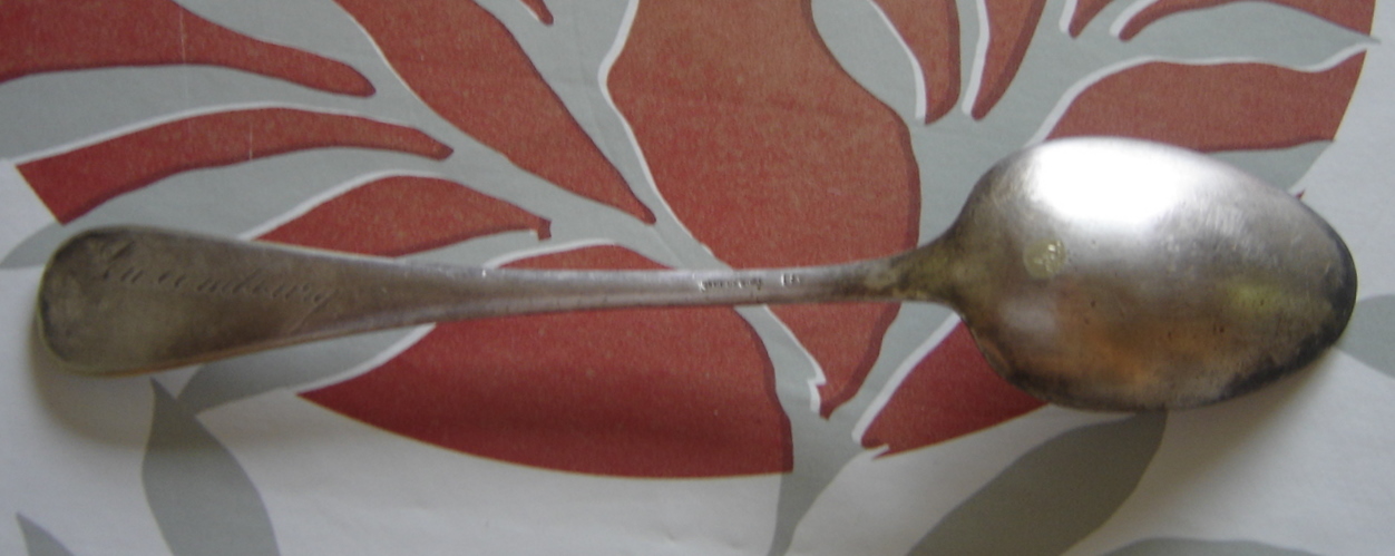 J'ai trouvé cette cuillère qui, je pense, est en métal argenté (étant complétement néophyte en la matière), avec écrit à sa base "Luxembourg" et une inscription plus haut où l'on distingue 2 PP et un E (le reste est impossible à lire) ; et plus haut, il y a un petit carré.