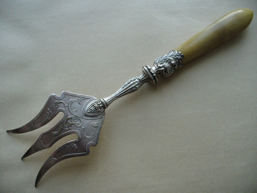 voici un couteau-pelle pour poisson avec manche en corne. A priori, il devrait être en métal argenté, mais je ne trouve pas de poinçon ni de marquage spécifique !