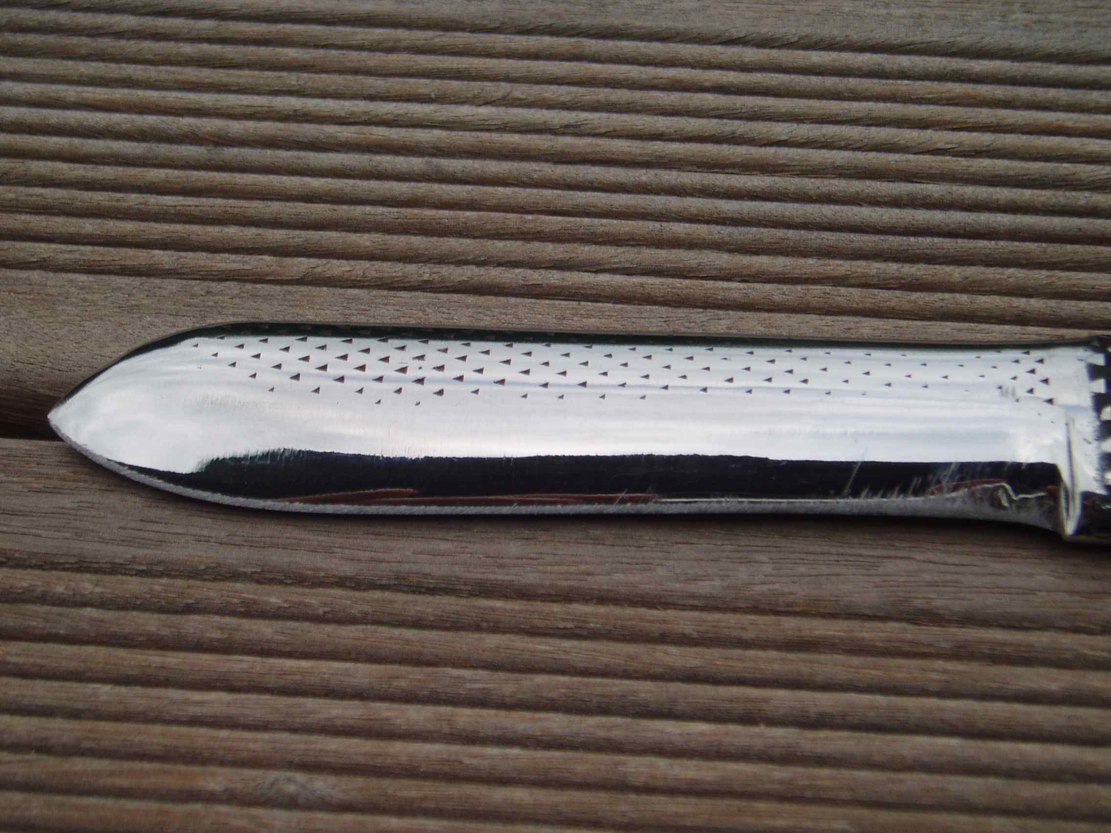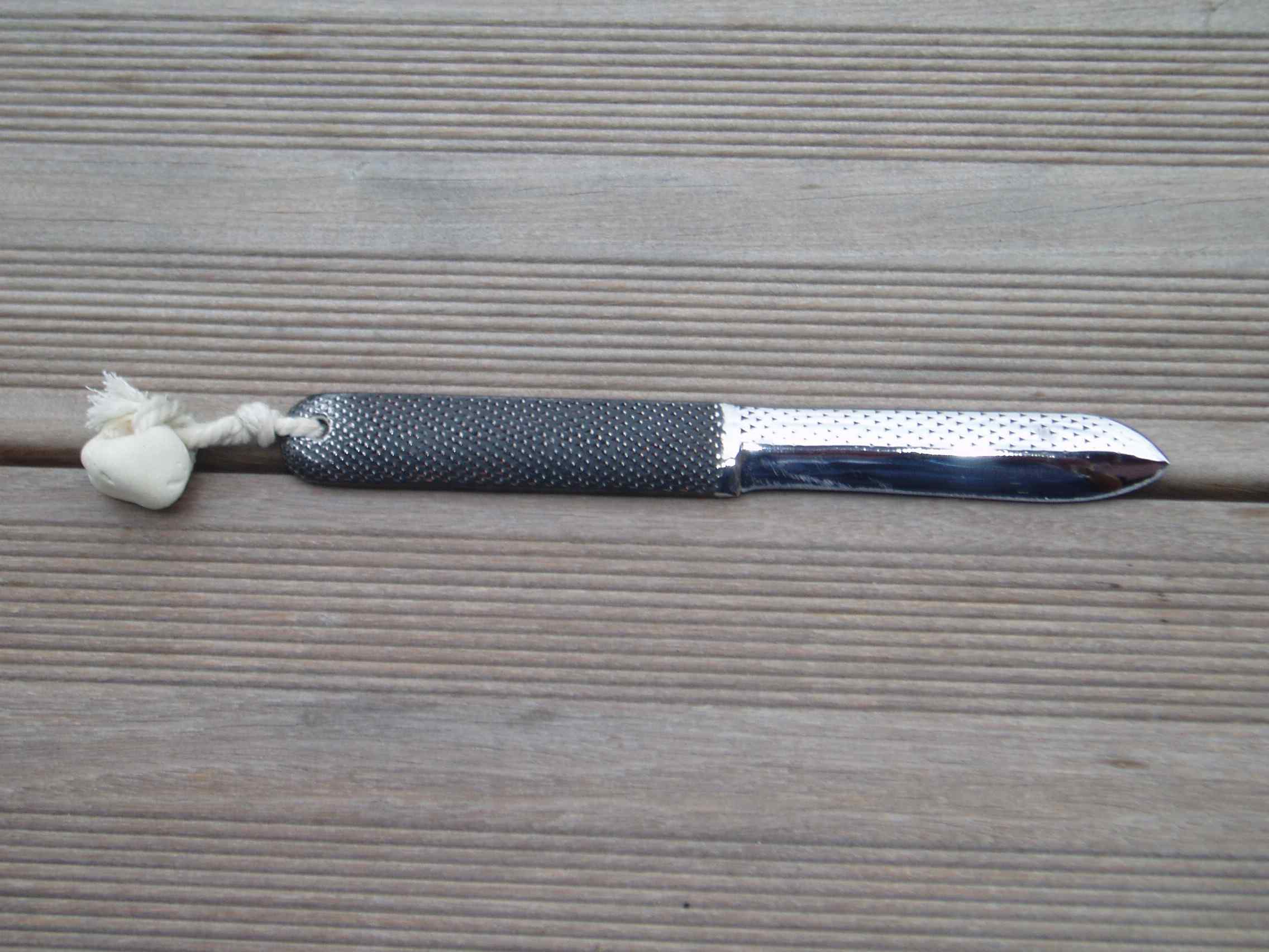 Je me suis amusé à en faire un couteau avec manche antidérapant et petites flèches creusées indiquant le sens de coupe... Il reste quelles traces d'affutage à la pierre sur le polissage miroir. Pour info : le caillou vient d'Oléron (Plage de St Georges).