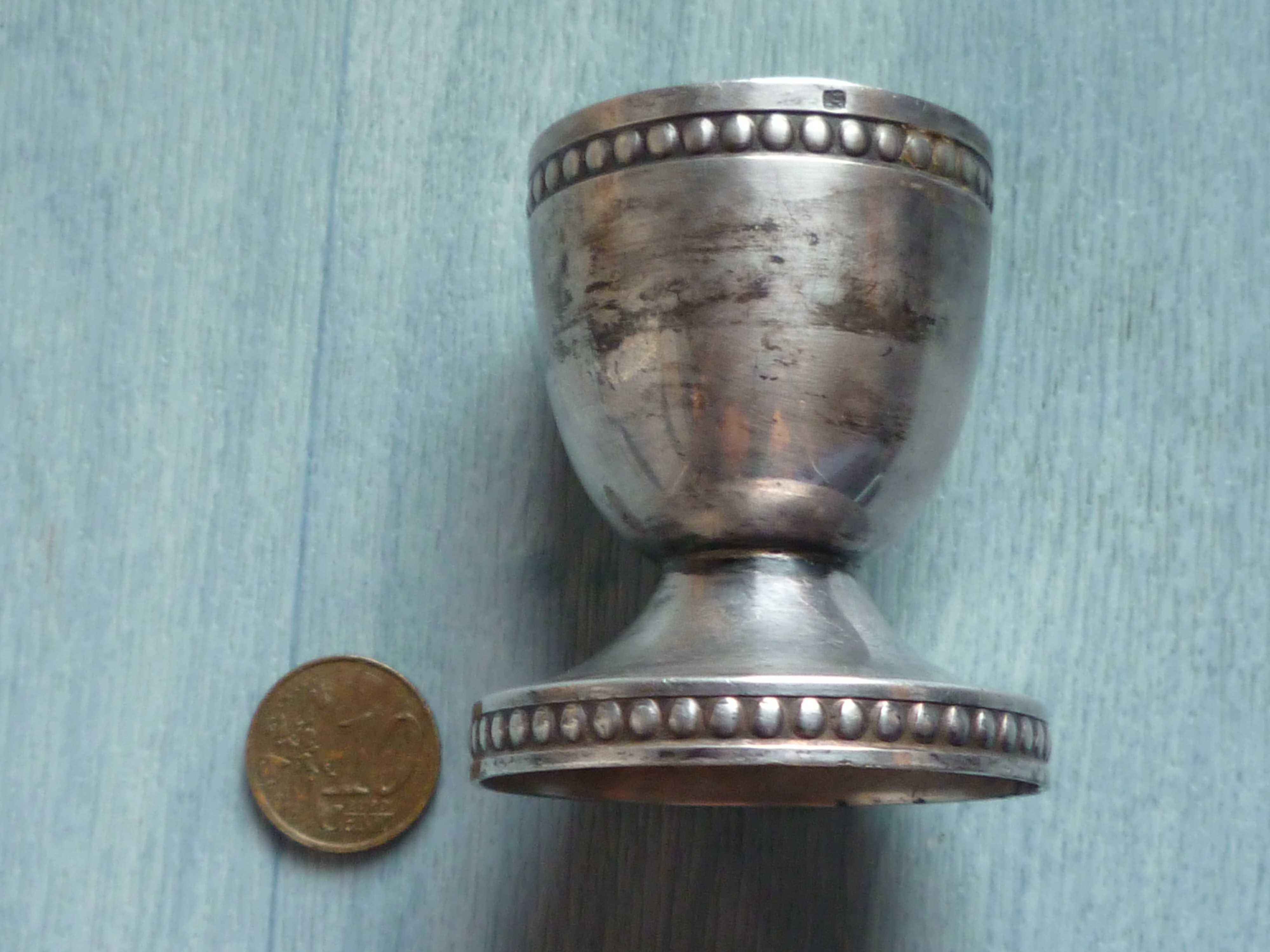 A première vue, c'est un coquetier. Je n'ai jamais vu le poinçon qui lui est apposé donc je ne sais pas si c'est de l'argent, de l'étain, du bronze argenté,... et encore moins si c'est français.