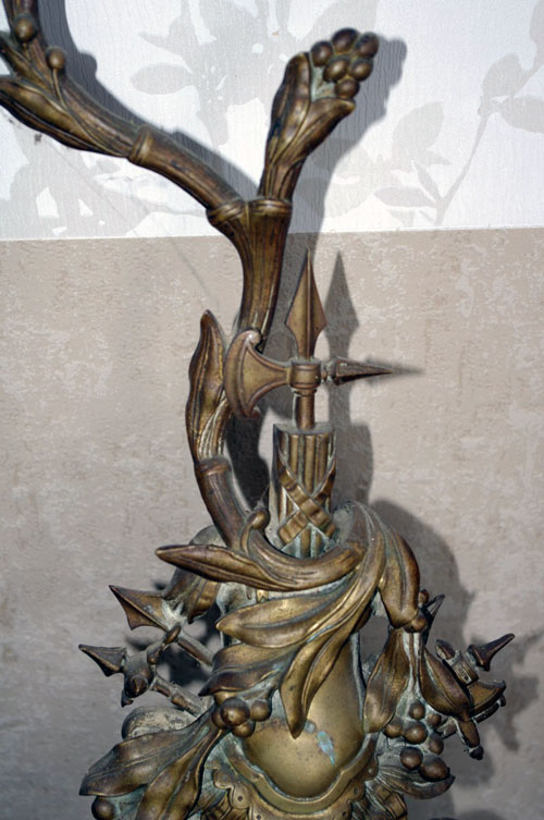 Nous y trouvons une bonne connotation gallo-romaine, mais bon.... mes recherches sont bien infructueuses pour l'instant : ancien fronton horloge, célèbre-t-il quelque chose ? Affichant cuirasse, hallebarde, casque, gui, laurier, bouclier, c'est un objet assez lourd d'une hauteur de 55 cm. :