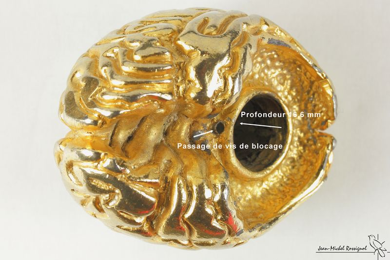 Le métal est gris et est recouvert d'une couche dorée (de l'or ?) très brillante aux endroits soumis à frottement et terne pour le reste, ce qui accentue le relief.