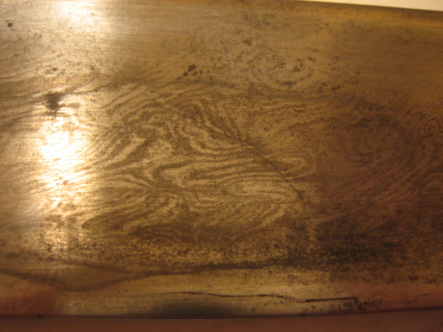 Pour la révélation, il faut faire un essai sur une petite partie de la lame, pas plus de quelques centimètres, avec une solution acide diluée : acide chlorhydrique, perchlorure de fer, acide nitrique (ce dernier étant plutôt à éviter car particulièrement dangereux).