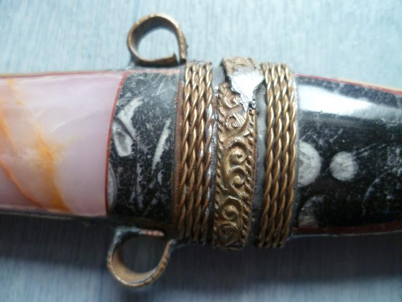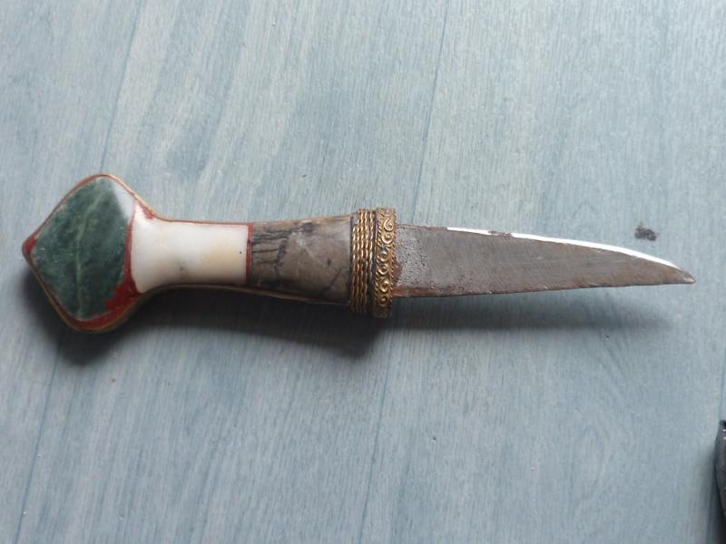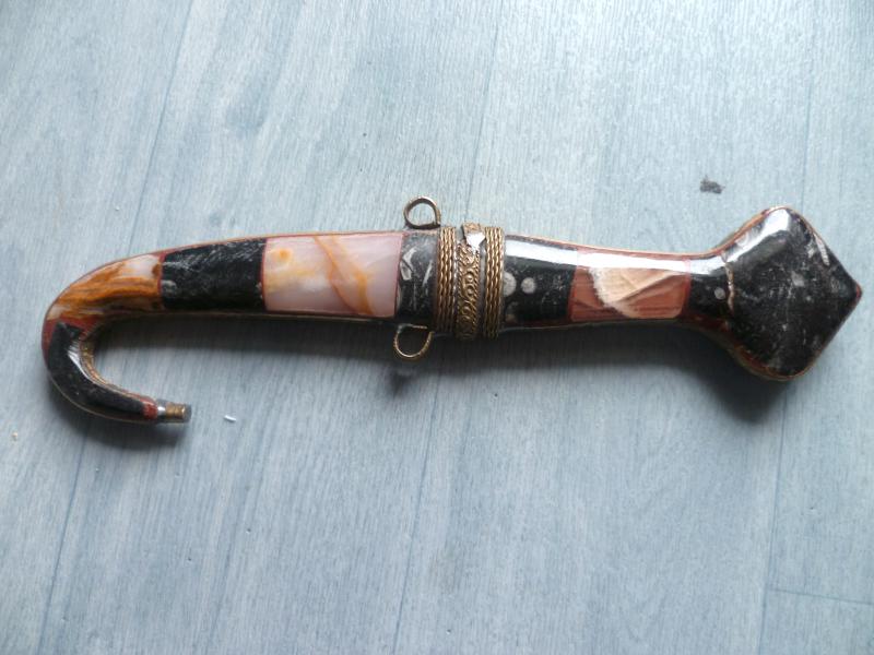Et il y en a une en particulier qui j'aimerais faire identifier : c'est une dague de type orientale, qui m'a été offerte par un ami marocain. Il la conservait depuis longtemps chez lui et il me l'a donnée car elle est entièrement ornée de pierre (je suis collectionneur de minéraux et fossiles).