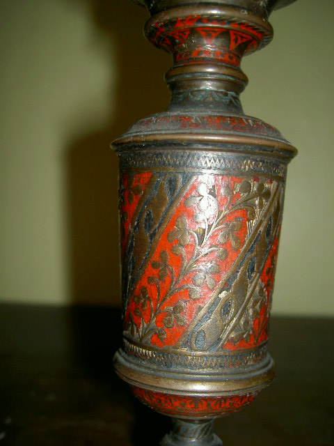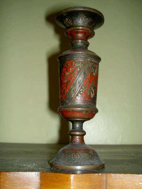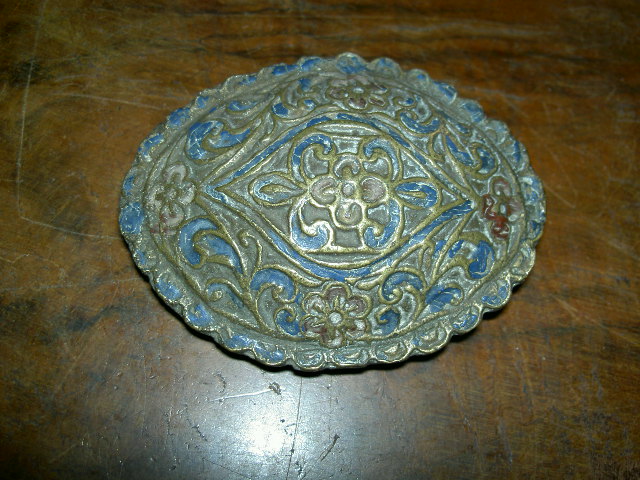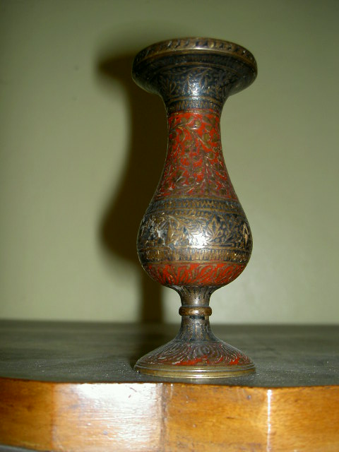 Je m'interroge sur ces deux petits vases anciens en bronze, ou laiton, incrustés de pâtes rouge et noire, au décor fleuri, mesurant 15,5cm , poids 450g pour le grand et 10,5cm et 150g pour le plus petit ; ainsi qu'une boucle de ceinture ancienne mesurant 9cmx7cm et pesant 100g, incrustée de pâtes bleu et rouge.