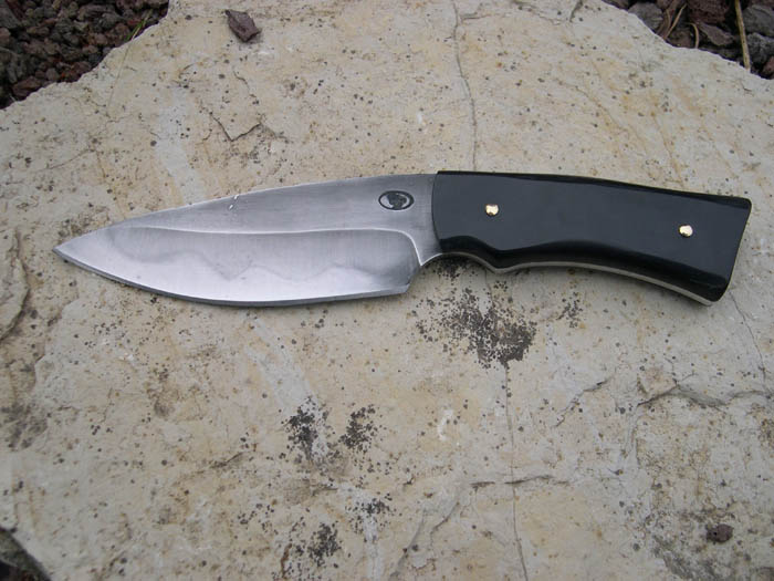 Deux couteaux fixes en aciers carbone (XC75) manche en buffle noir. Les deux sont en trempe sélective mais seul le plus petit est révélé.