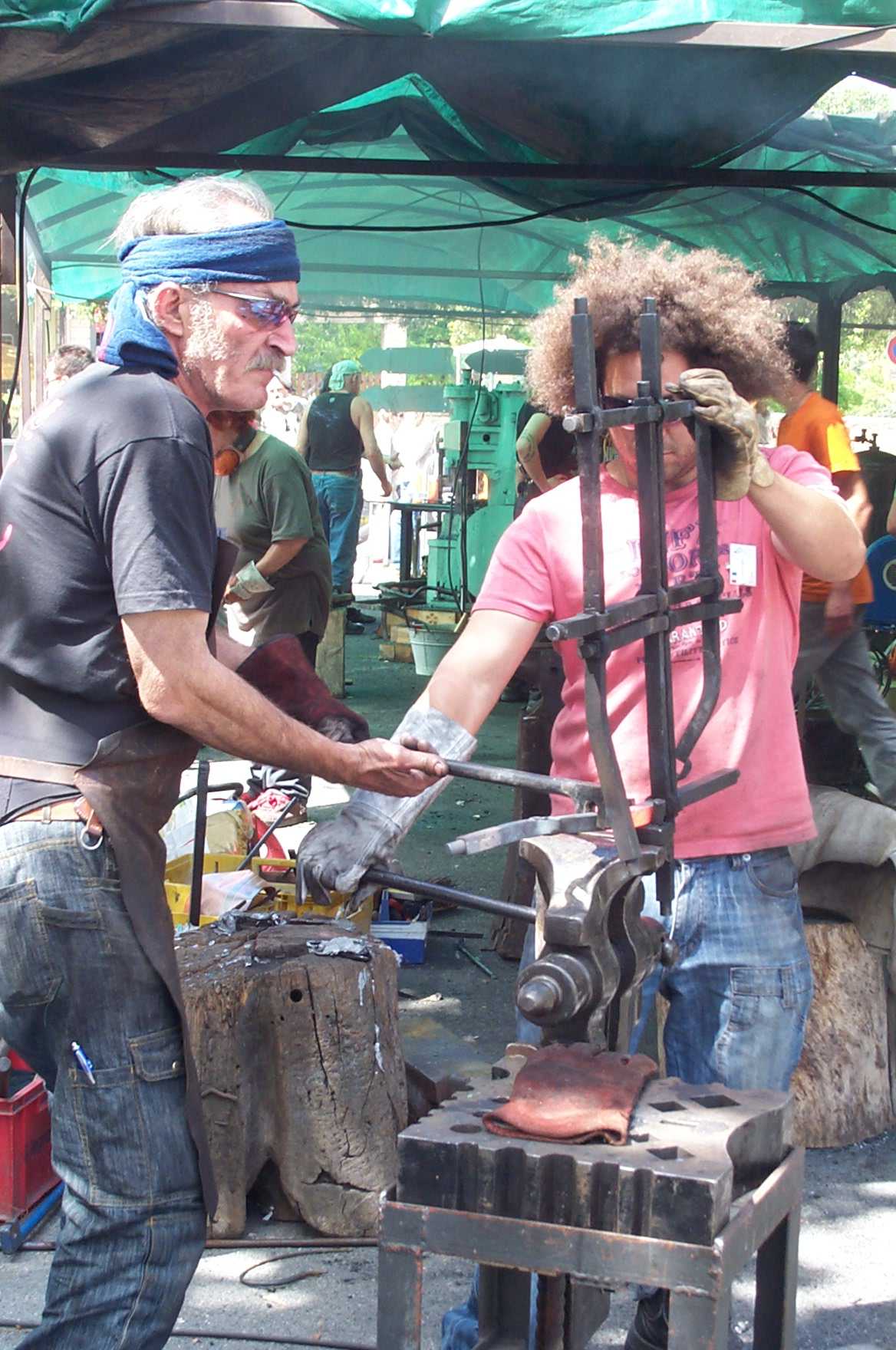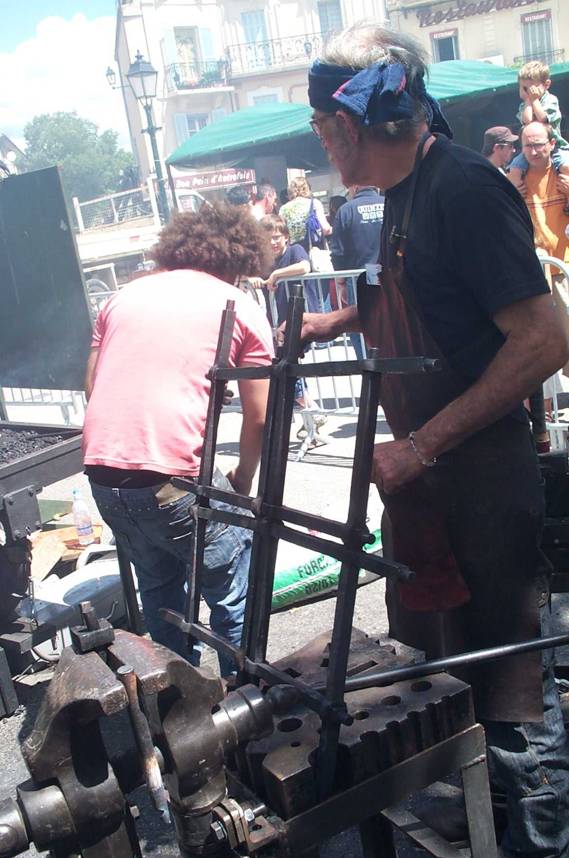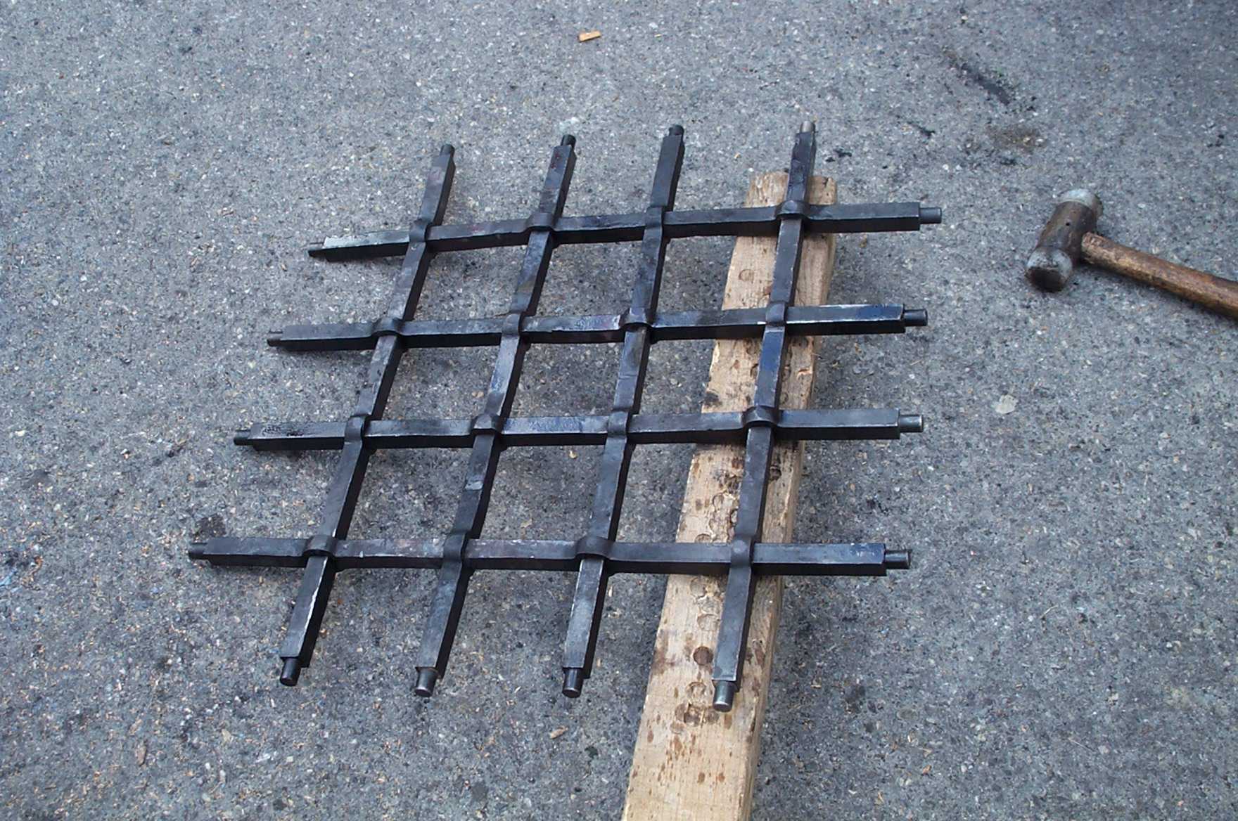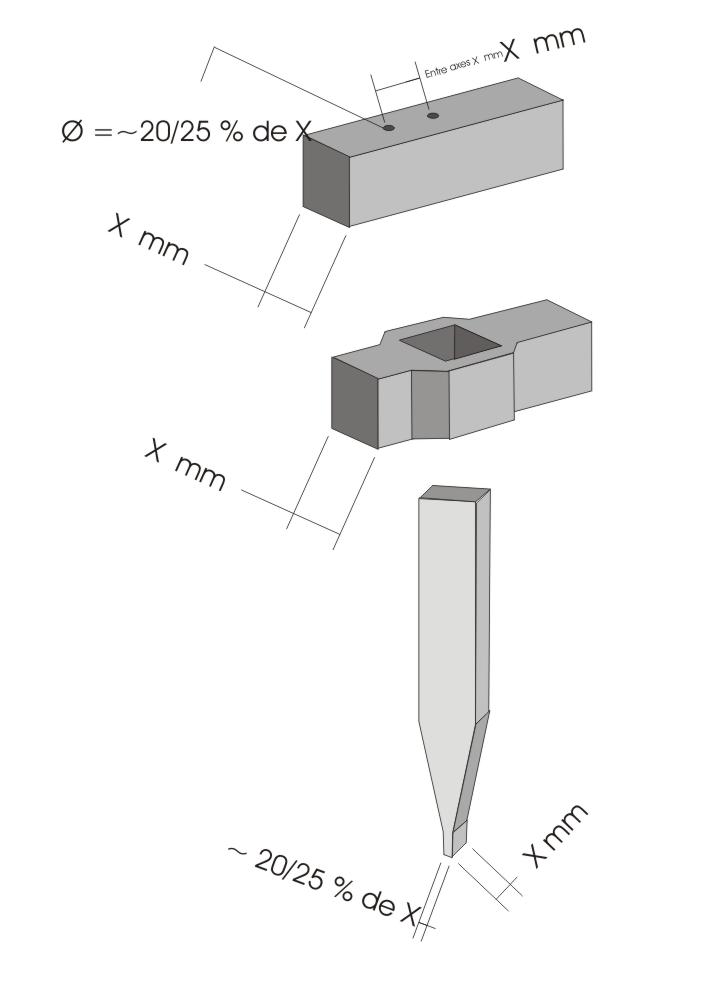 Ce burin est carré et a un bout plat large d'environ 20/25 % de la taille du fer à passer. De ce fait, il fait un passage par refoulement d'un côté puis de l'autre. A la fin de ce "perçage-refoulement", il tombe un petit morceau de métal que le burin à arraché. Ensuite re-chauffe et écartement du trou.