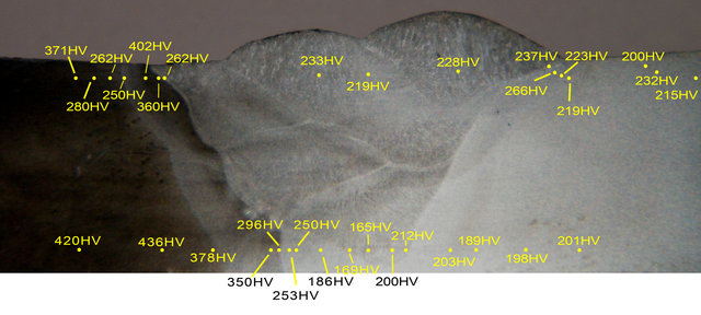 Pour info, dans l'industrie on aime pas du tout dépasser les 380 HV10 sous cordon (dixit EuroNorm), dans mon domaine on s'interdit de dépasser 325 HV10. Ici, on est très dur et trop fragile, l'assemblage est dangereux car imprévisible : 436 HV10 c'est énorme, ici l'acier va casser en service comme du verre.