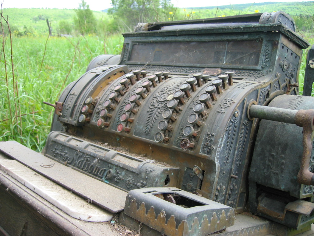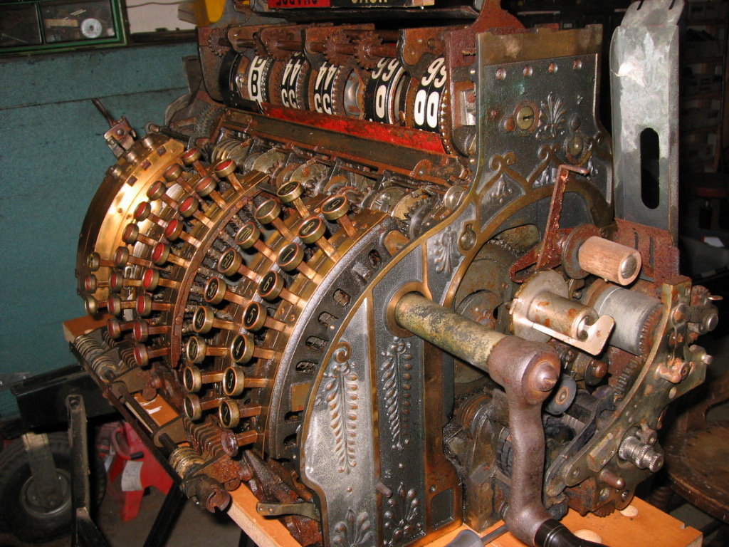 J'ai trouvé une vieille caisse enregistreuse datant autour de 1915. Elle m'attendait depuis plusieurs décennies dans une maison abandonnée et en ruines. Le revêtement est parfois plaqué laiton et parfois carrément laiton.