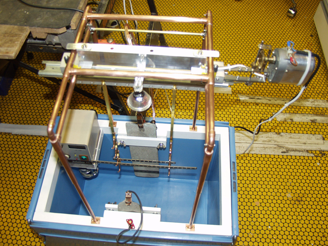 -Le système d'agitation mécanique des pièces à traiter, la vitesse optimale de la barre cathodique retrouvée dans la bibliographie est de 5 à 6mètres/mn. J'ai construit le système avec des pièces Meccano, bielle, engrenages coniques à nombre de dents différents pour adapter la vitesse de rotation de la bielle par rapport à celle du moteur électrique (moteur moderne en basse tension). L'alimentation électrique du moteur permet également de faire varier la vitesse du moteur (ceci n'est pas nécessaire, mais je l'avais). La bielle permet de provoquer un va et vient de la barre cathodique supportant les pièces. Pour améliorer le guidage et réduire la résistance mécanique du mouvement de va et vient, la barre cathodique a été fixée sur la partie mobile d'un système de coulisse de tiroir (système à bille). l'ensemble a été testé pendant de longues heures, il est fiable et très silencieux. Le moteur et le réducteur de vitesse sont visibles sur la droite